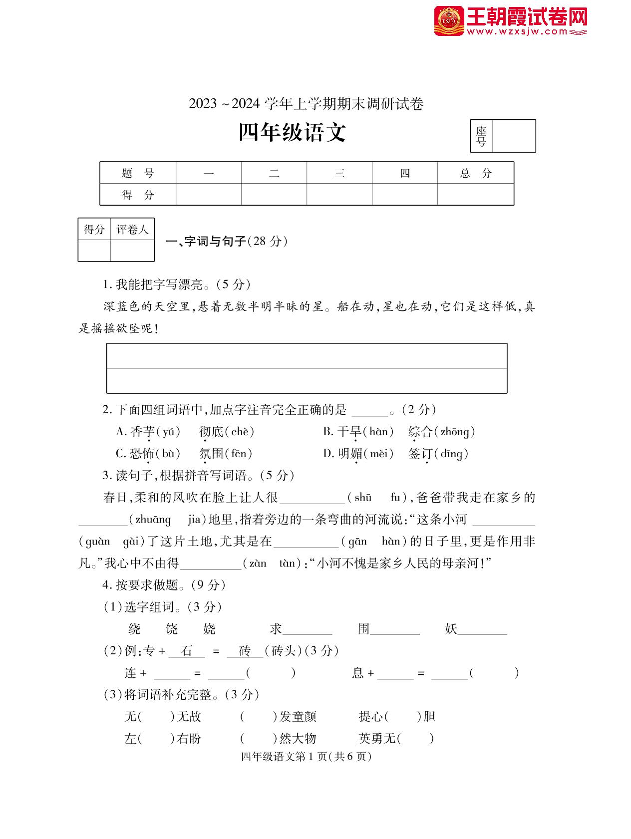 河南省平顶山市舞钢市2023-2024学年上学期期末调研试卷四年级语文(人教版)