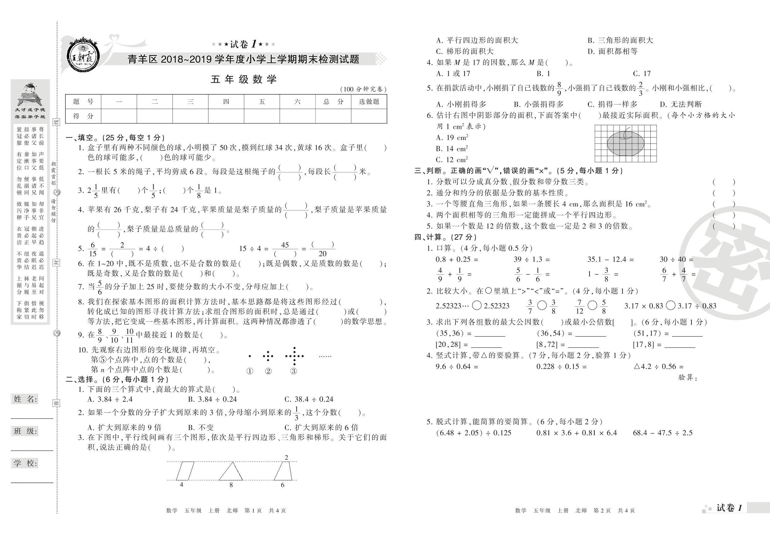 2018-2019学年第一学期成都市青羊区五年级数学试卷(北师版)【1】