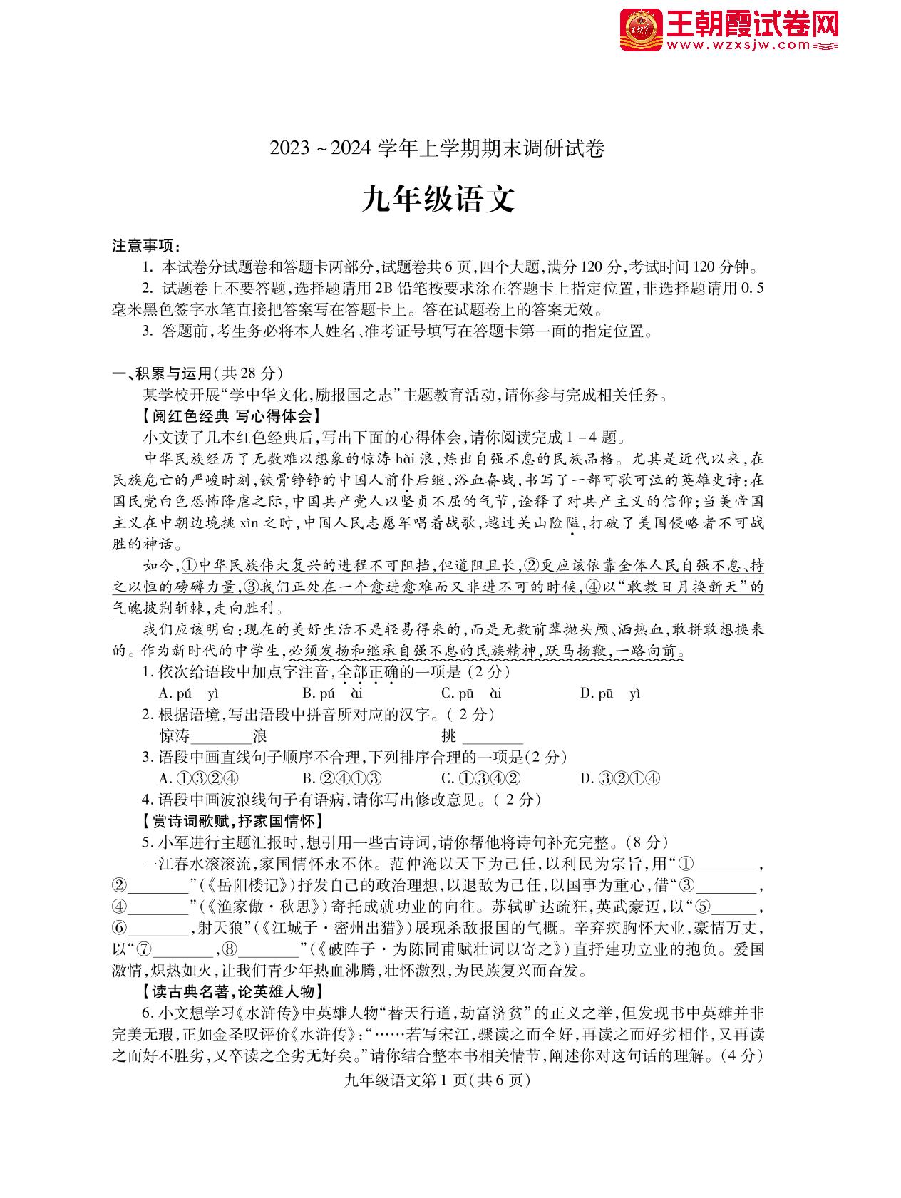 河南省平顶山市舞钢市2023-2024学年上学期期末调研试卷九年级语文(人教版)