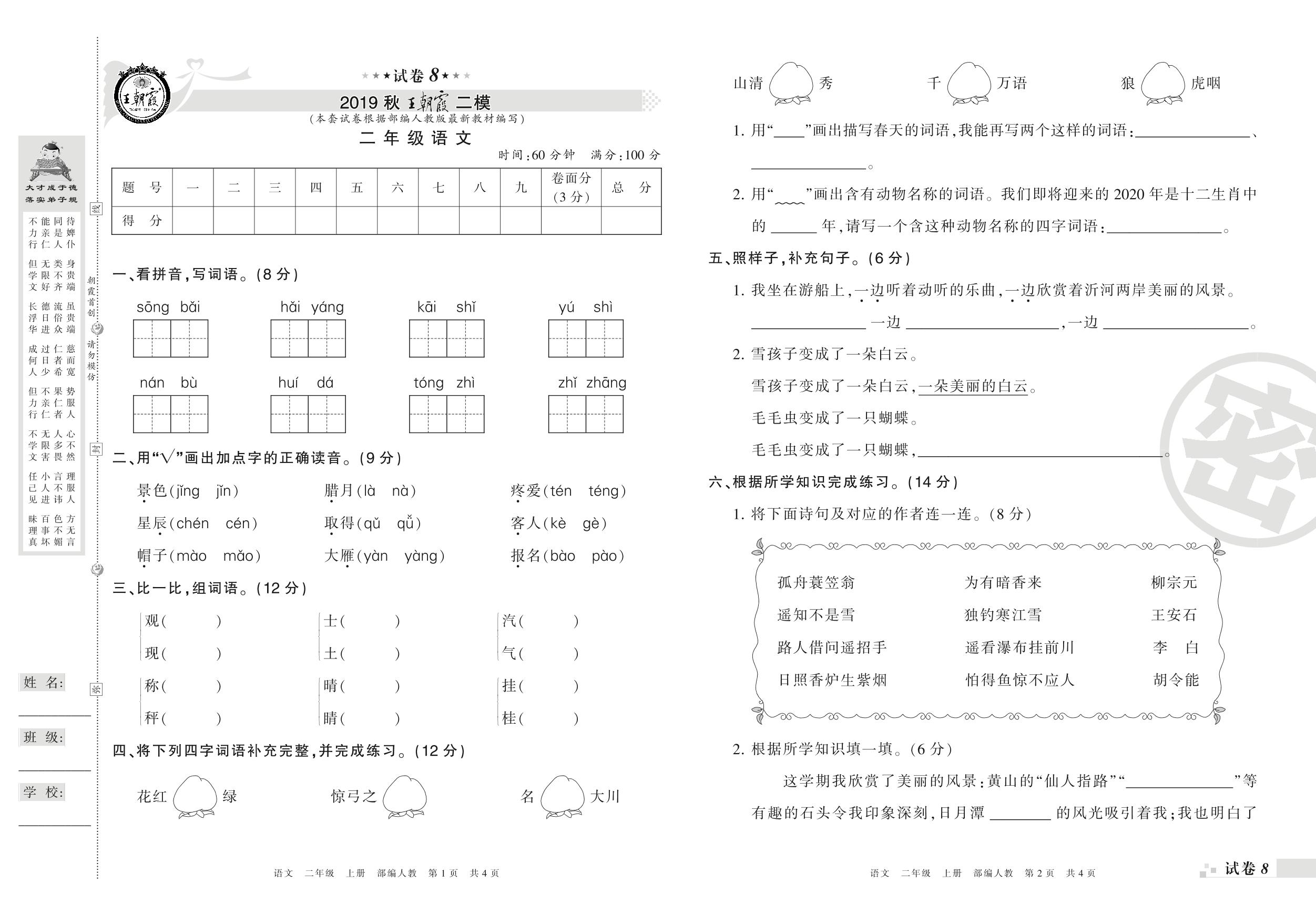 王朝霞期末模拟卷二年级上册语文(人教版)_R21080171152【8】