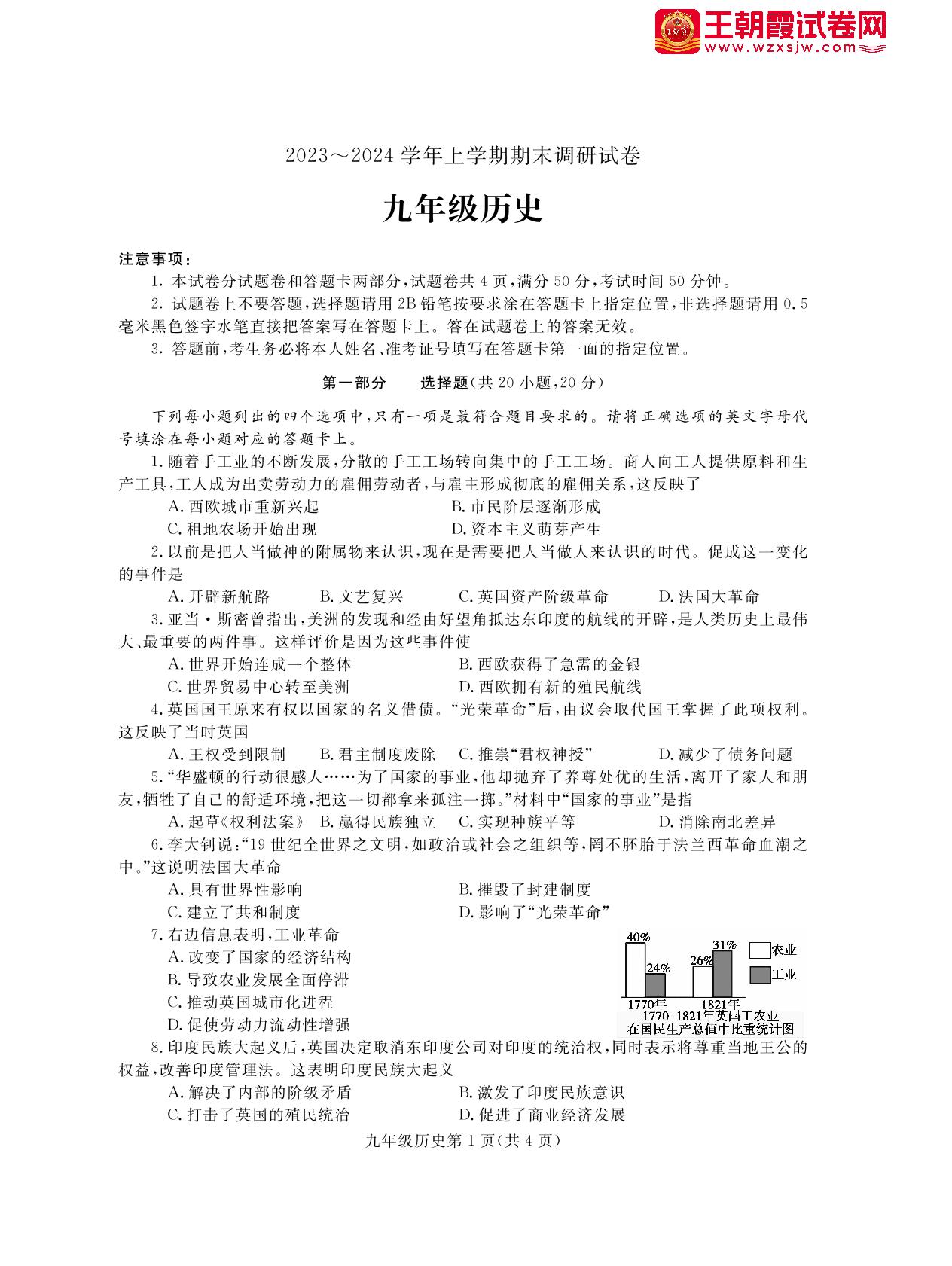 河南省平顶山市舞钢市2023-2024学年上学期期末调研试卷九年级历史(人教版)