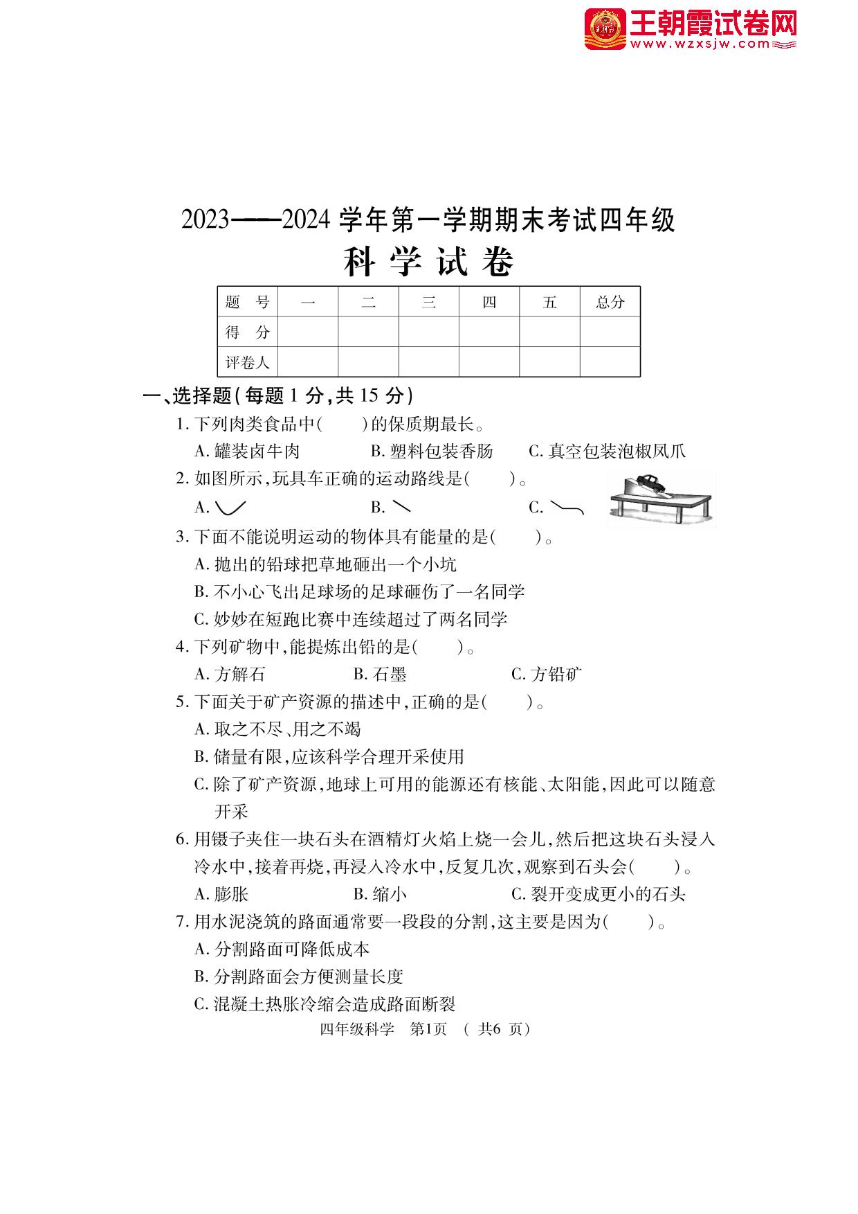 河南省洛阳市嵩县2023-2024学年第一学期期末考试试卷四年级科学(大象版)