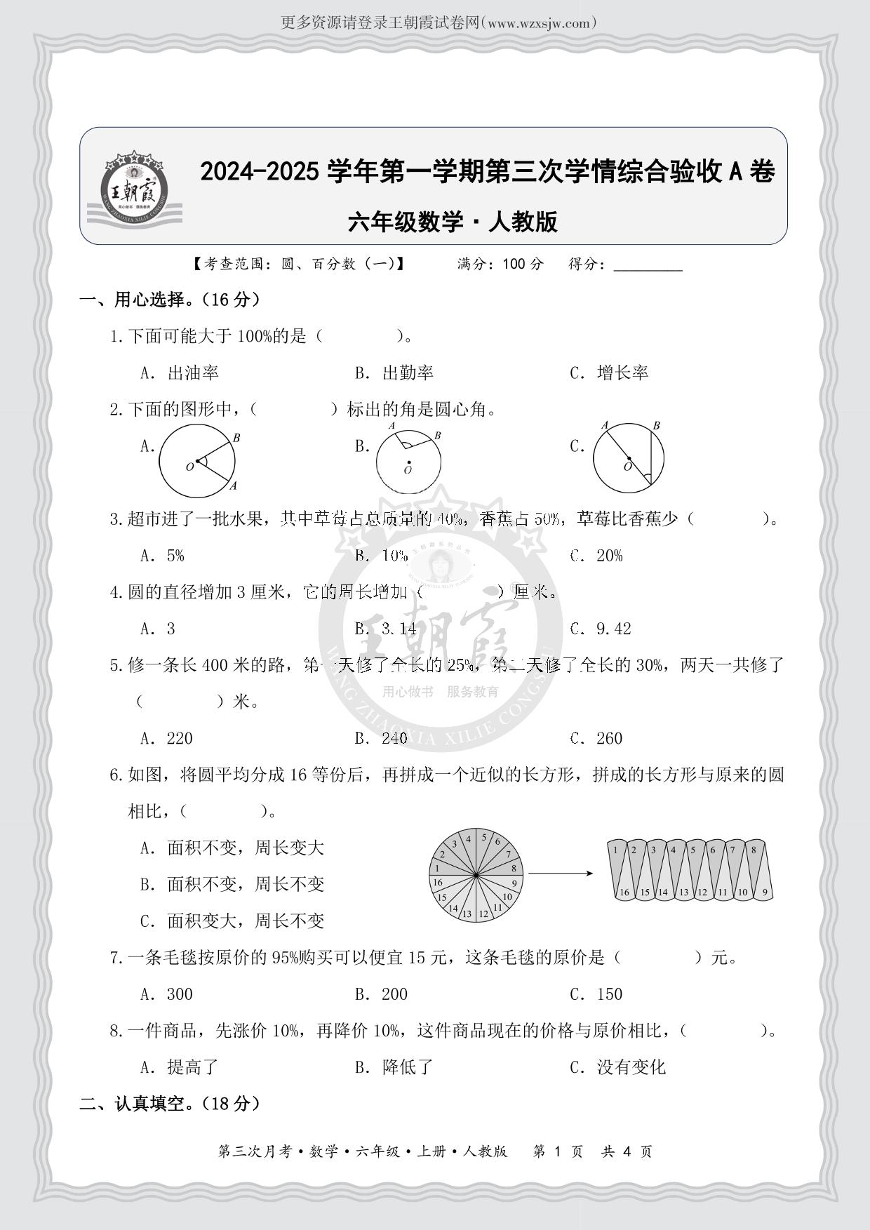 2024-2025学年第一学期六年级数学第三次(月考)学情综合验收A卷(人教版)