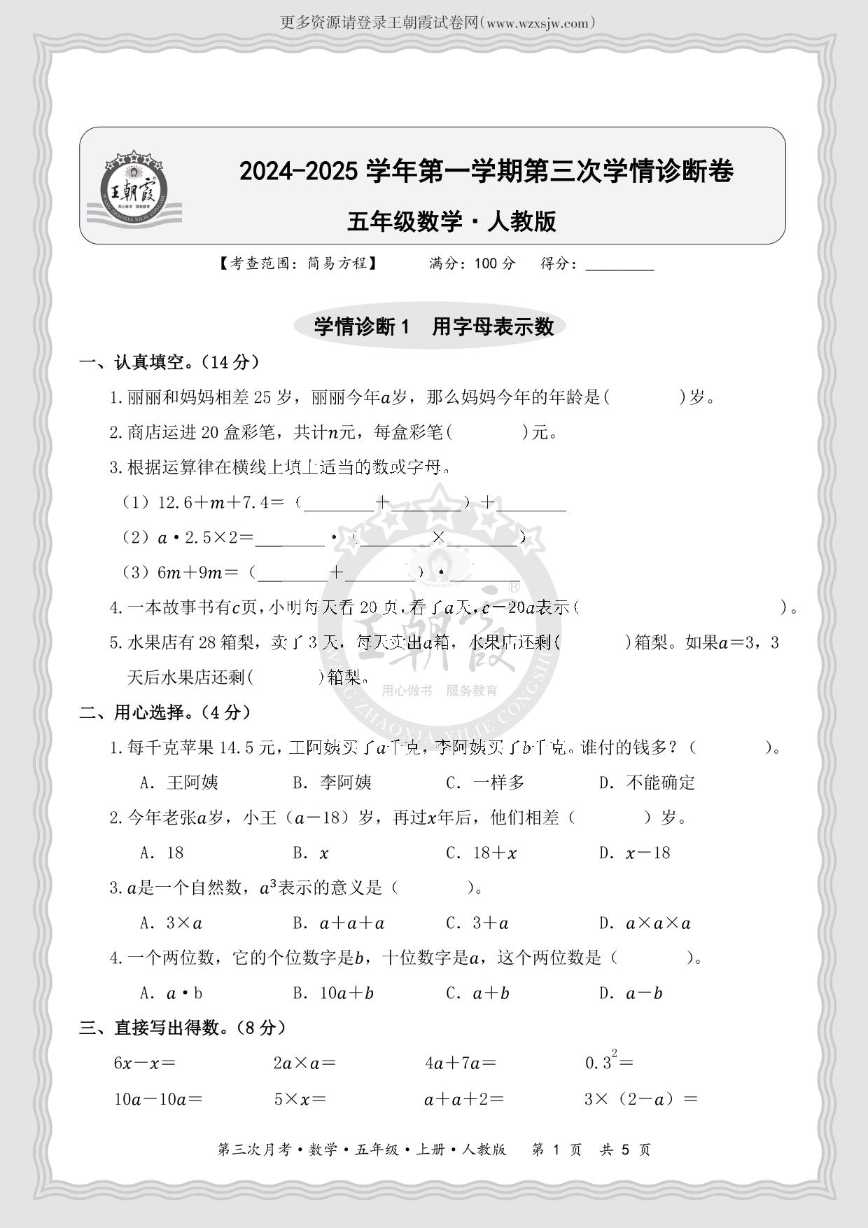 2024-2025学年第一学期五年级数学第三次(月考)学情诊断卷(人教版)