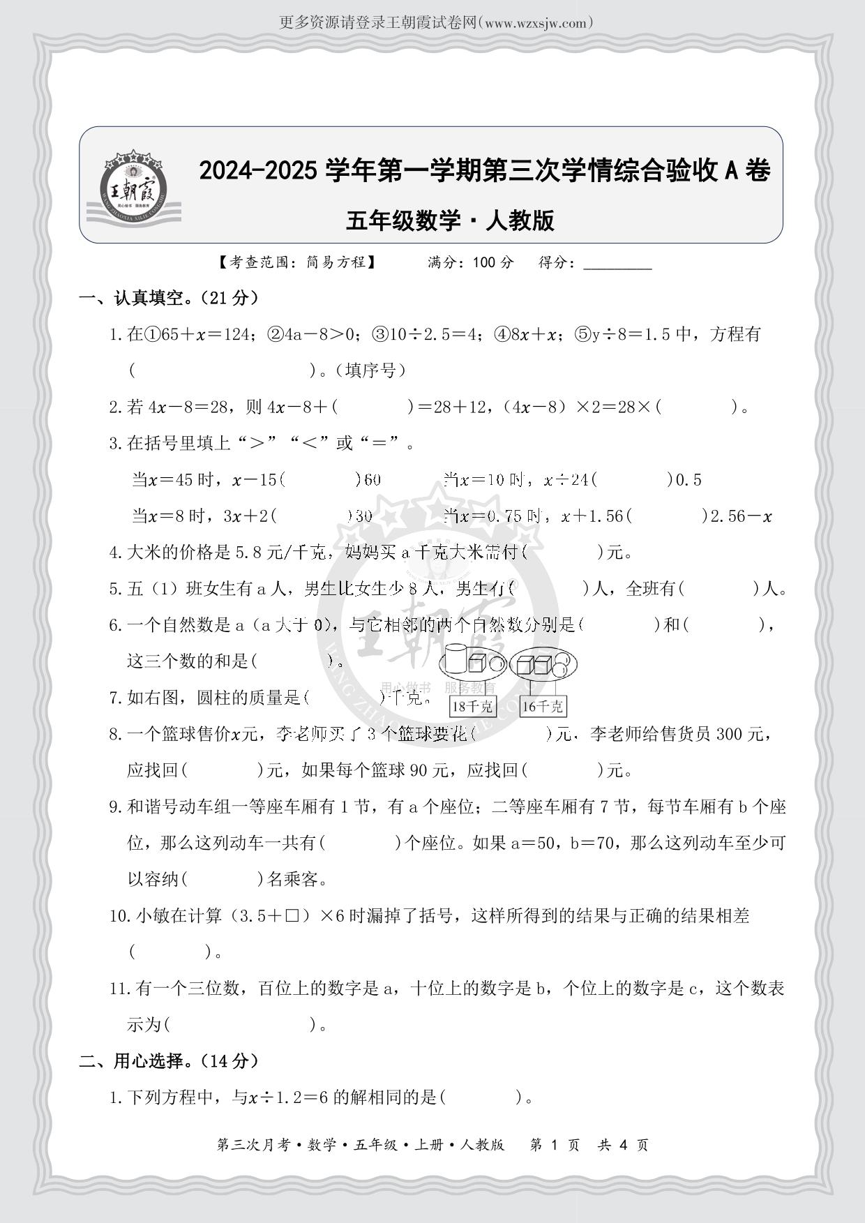2024-2025学年第一学期五年级数学第三次(月考)学情综合验收A卷(人教版)