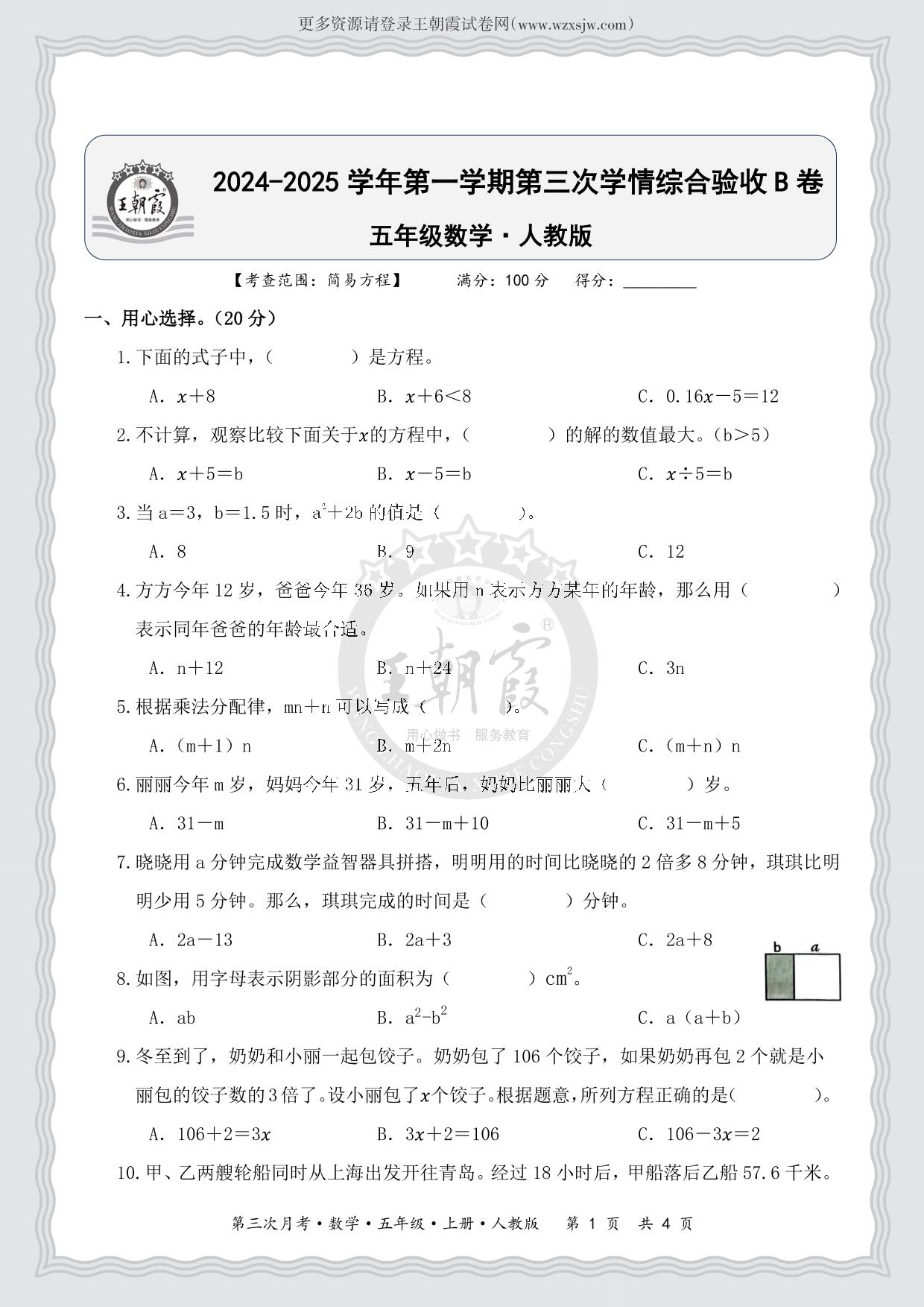 2024-2025学年第一学期五年级数学第三次(月考)学情综合验收B卷(人教版)