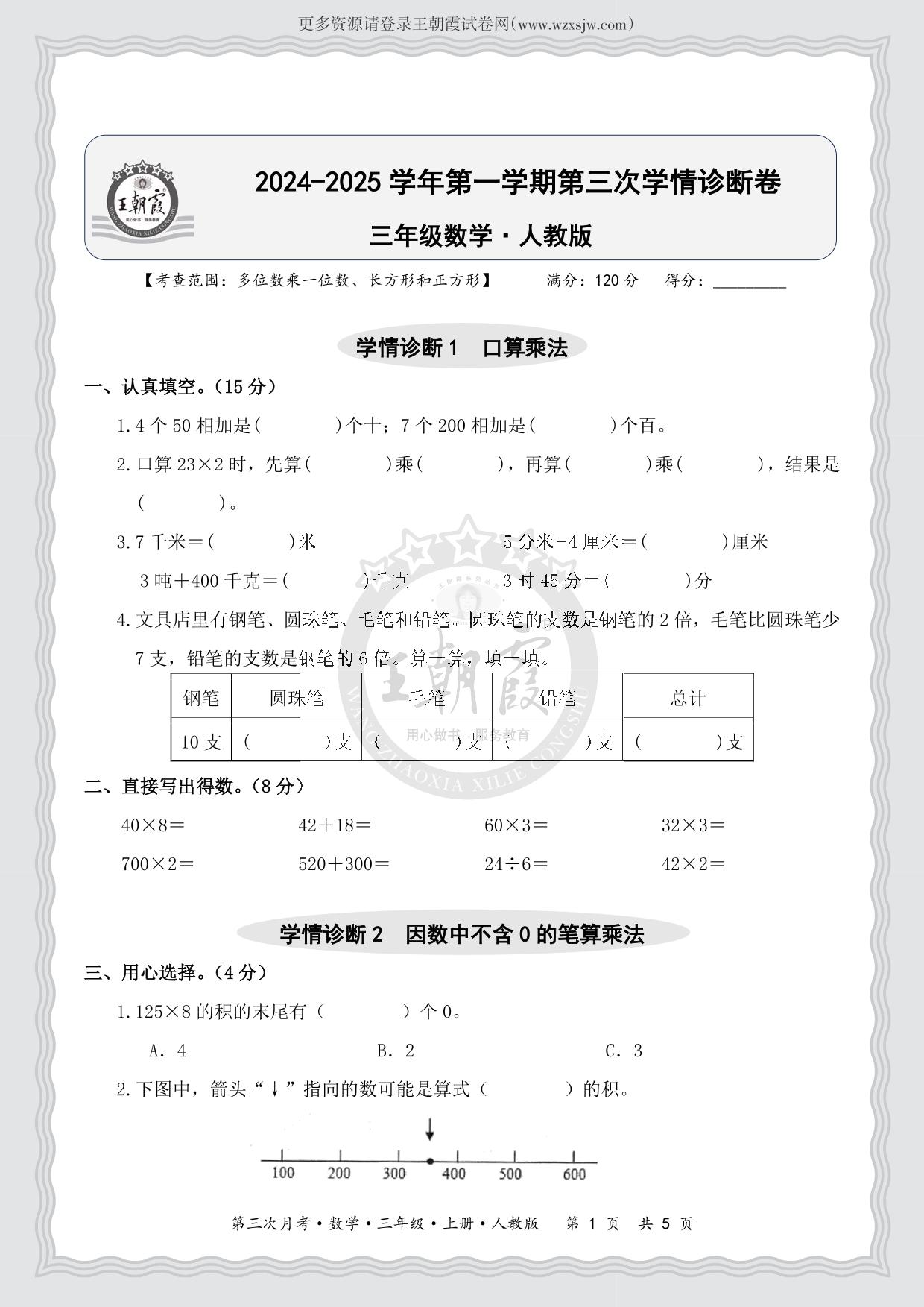 2024-2025学年第一学期三年级数学第三次(月考)学情诊断卷(人教版)