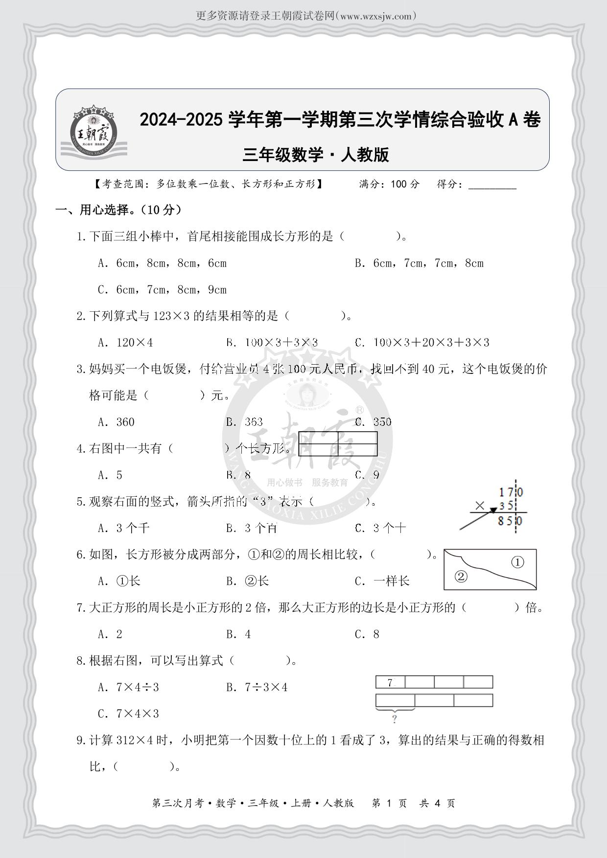 2024-2025学年第一学期三年级数学第三次(月考)学情综合验收A卷(人教版)