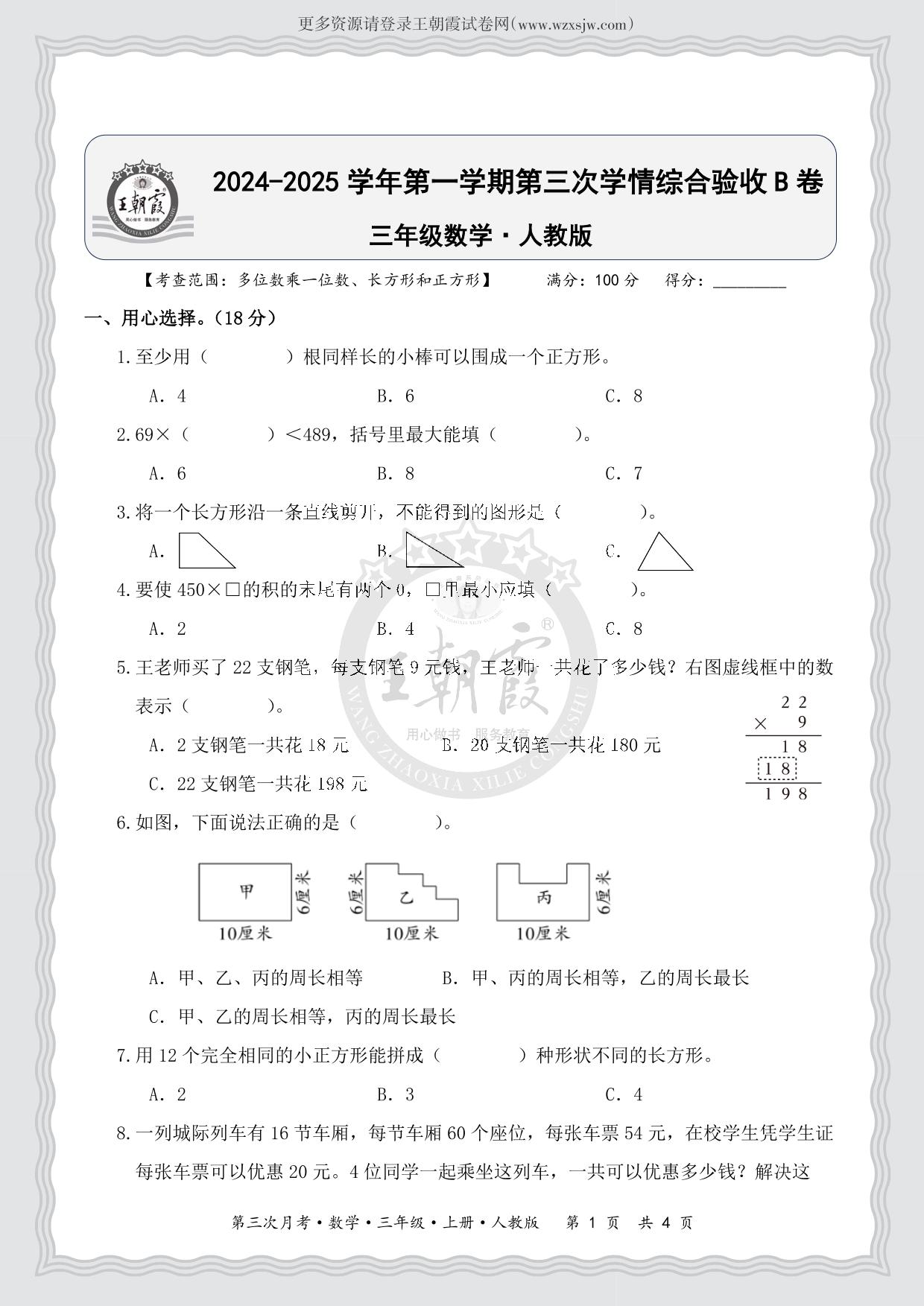 2024-2025学年第一学期三年级数学第三次(月考)学情综合验收B卷(人教版)