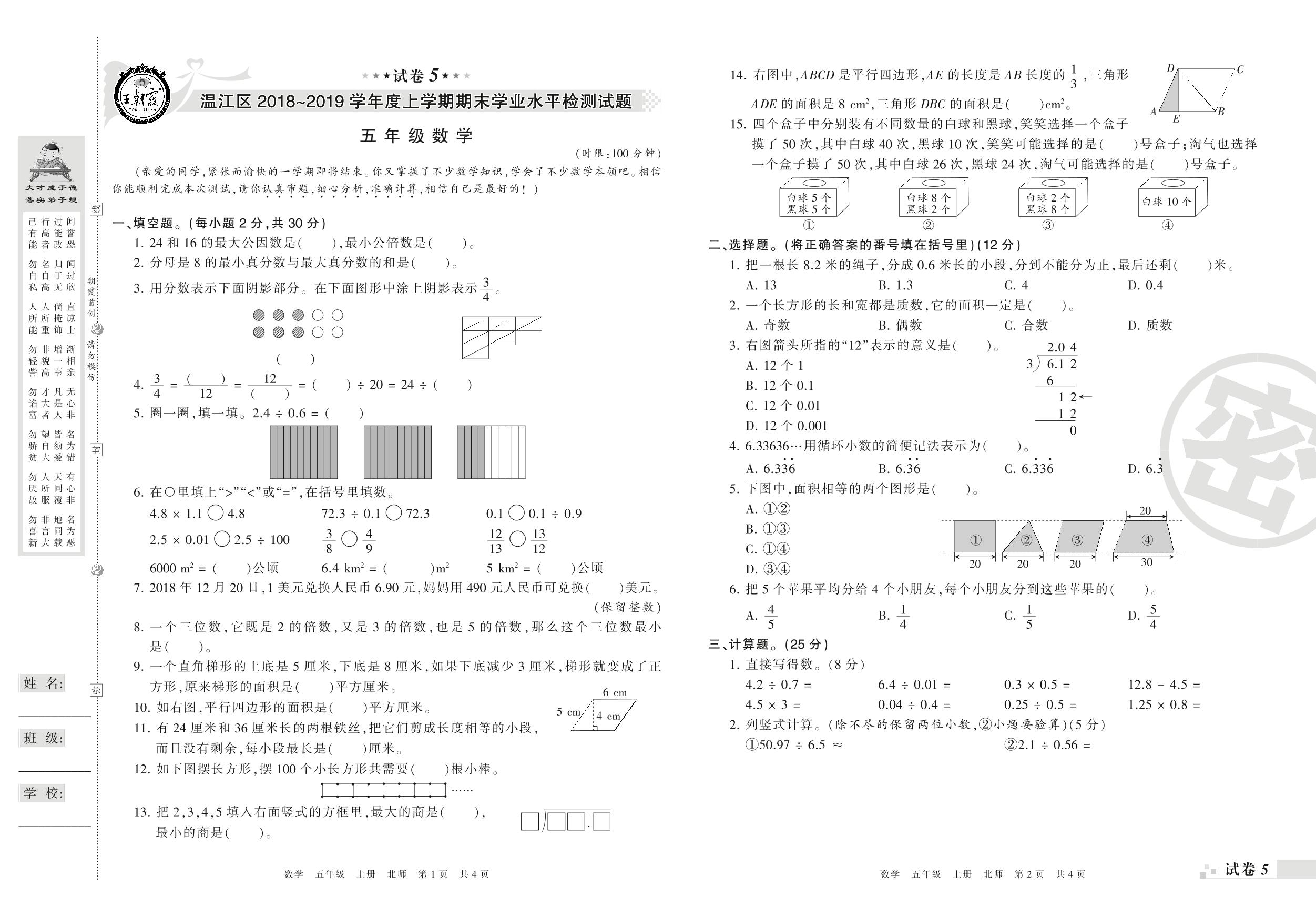 2018-2019学年第一学期成都市温江区五年级数学试卷(北师版)【5】