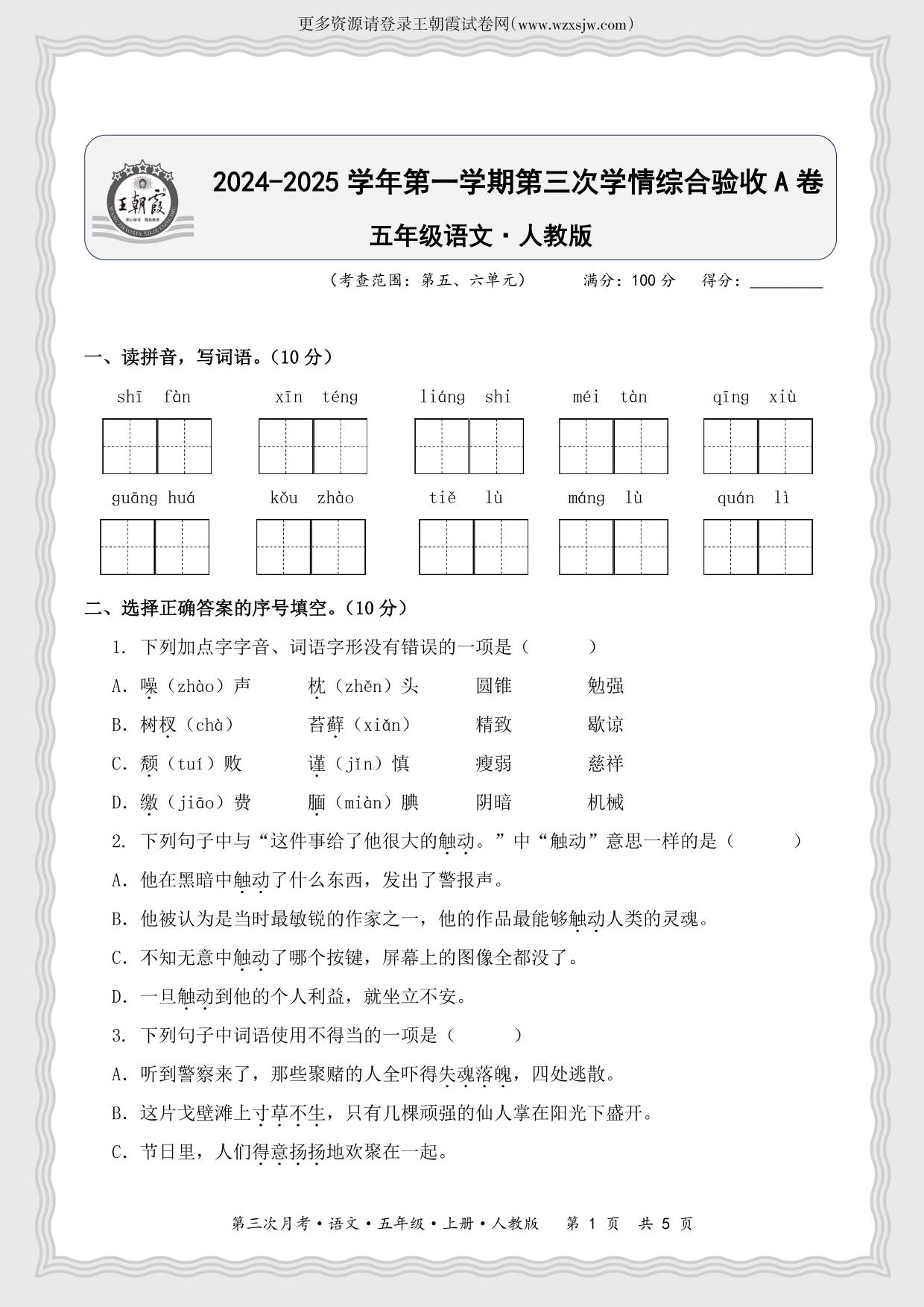 2024-2025学年第一学期五年级语文第三次(月考)学情综合验收A卷(人教版)