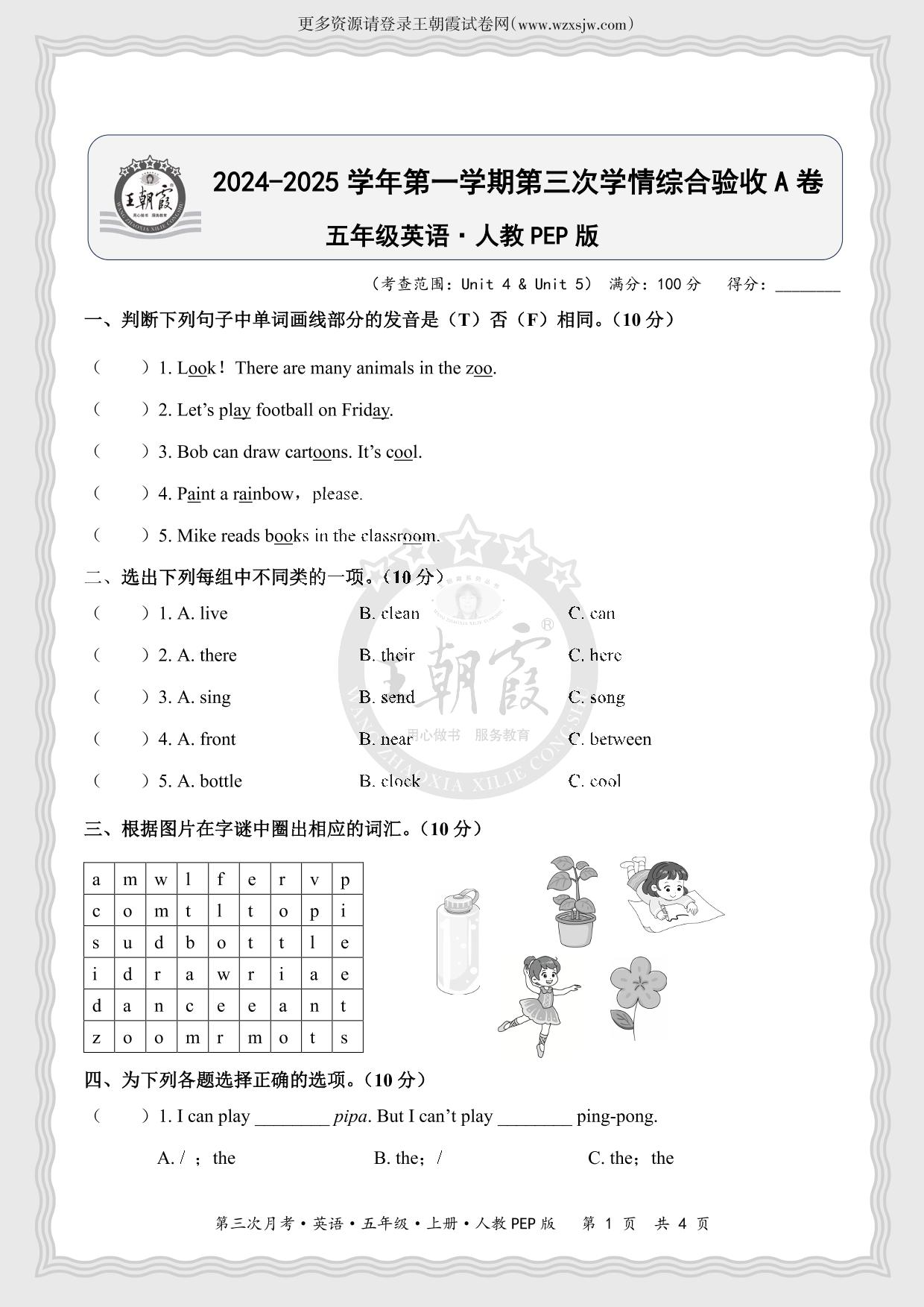 2024-2025学年第一学期五年级英语第三次(月考)学情综合验收A卷(人教PEP版)