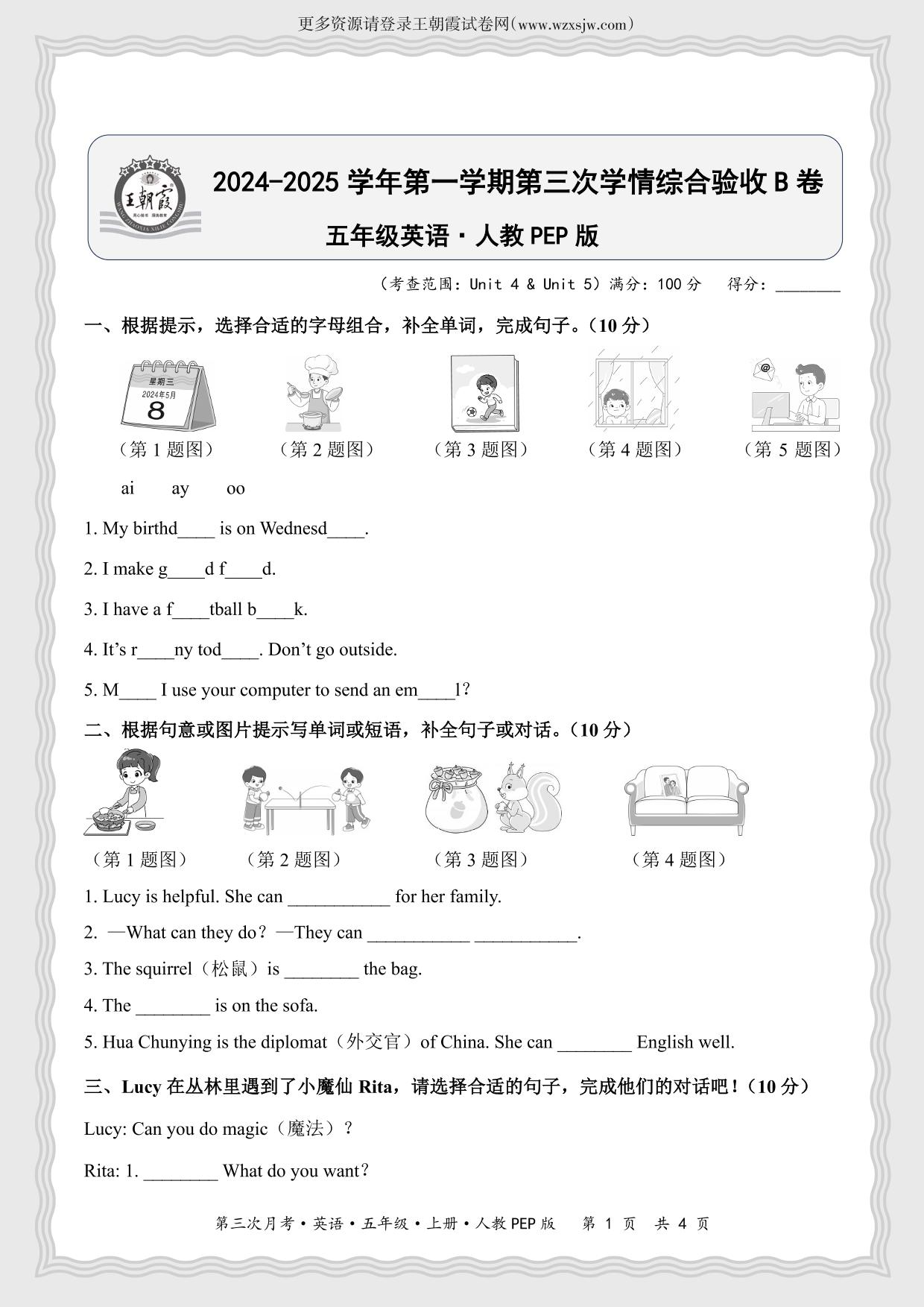 2024-2025学年第一学期五年级英语第三次(月考)学情综合验收B卷(人教PEP版)
