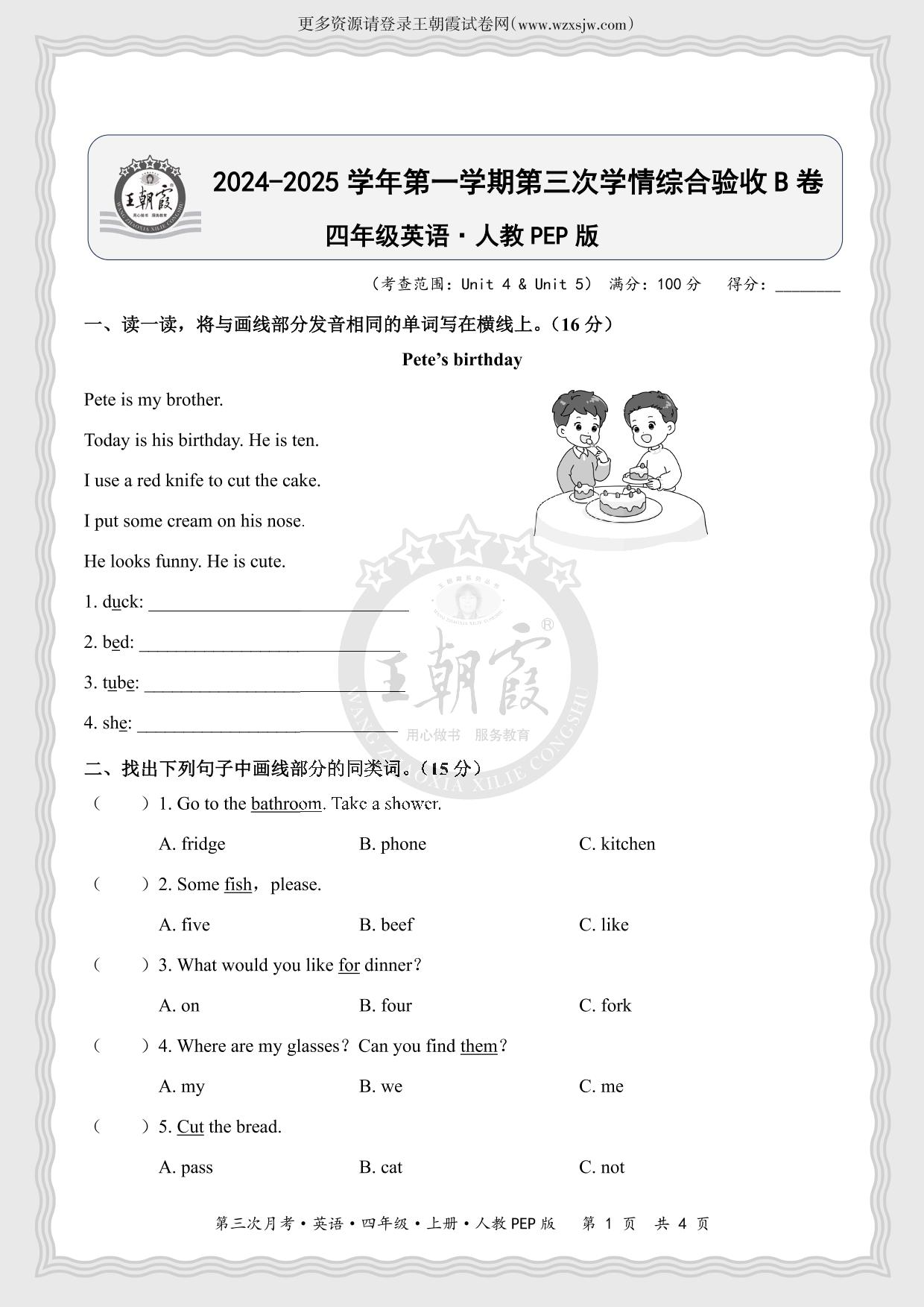 2024-2025学年第一学期四年级英语第三次(月考)学情综合验收B卷(人教PEP版)
