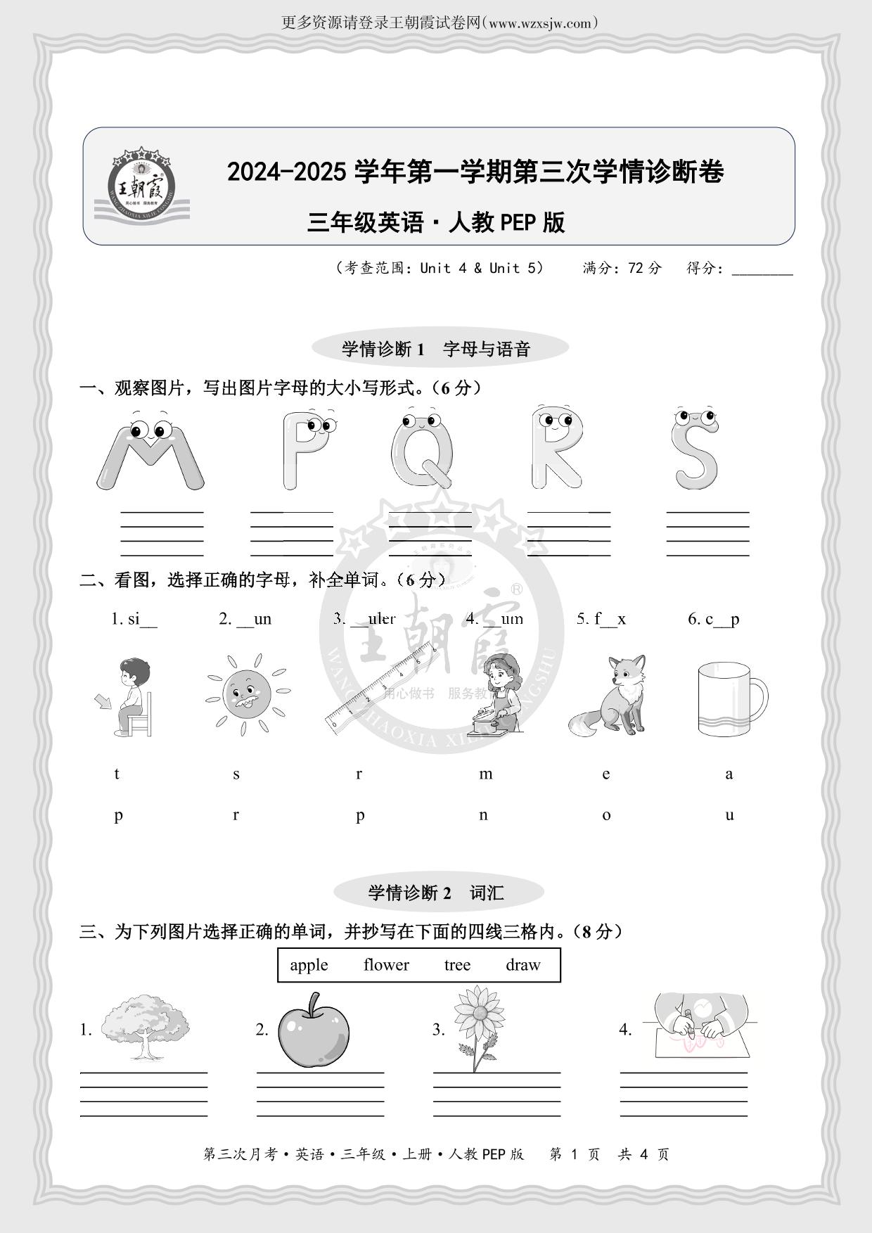 2024-2025学年第一学期三年级英语第三次(月考)学情诊断卷(人教PEP版)