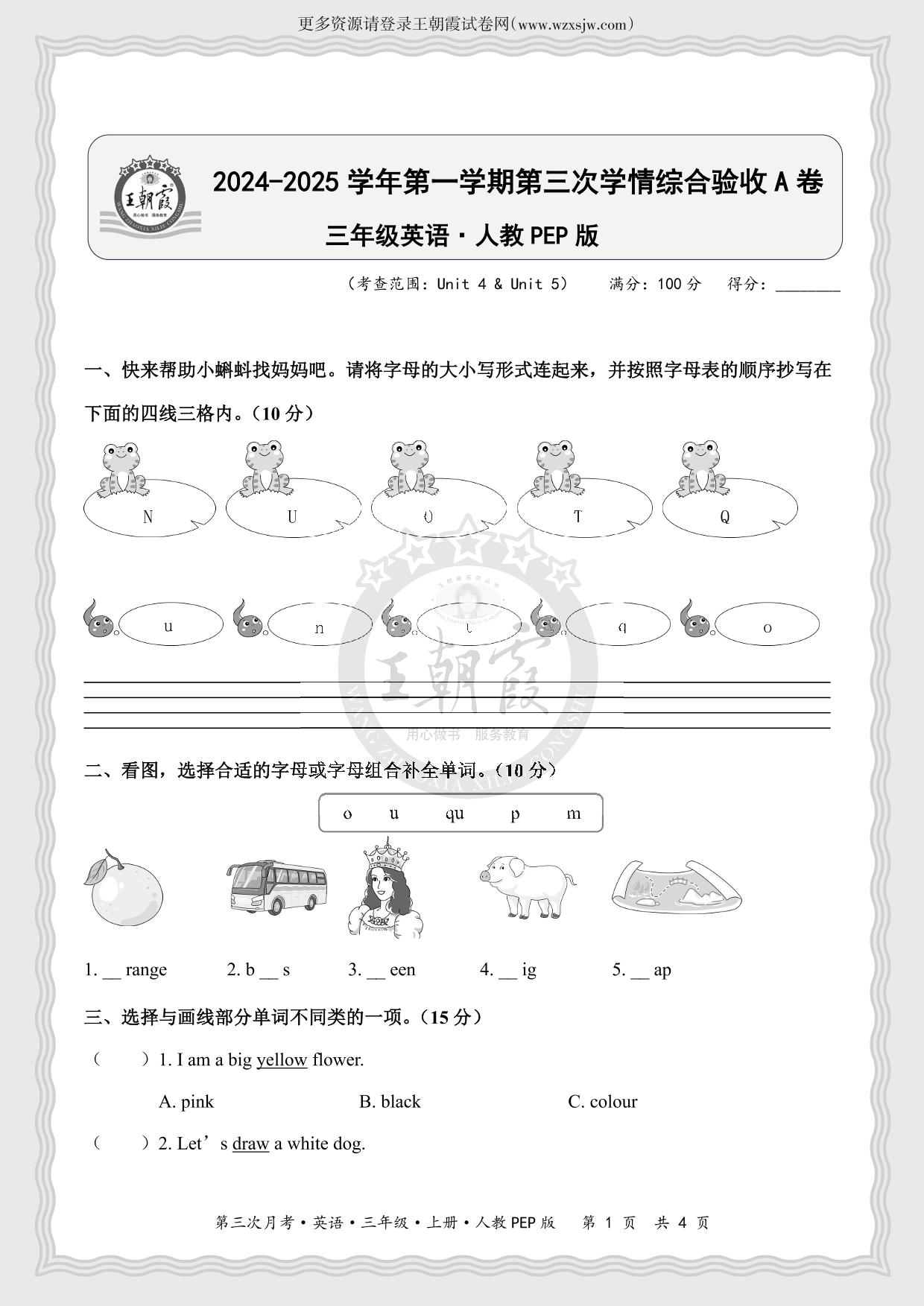 2024-2025学年第一学期三年级英语第三次(月考)学情综合验收A卷(人教PEP版)