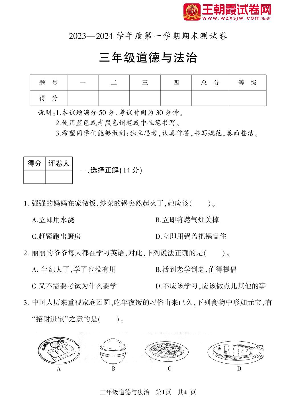 山西省临汾市侯马市2023-2024学年度第一学期期末测试卷三年级道德与法治(人教版)