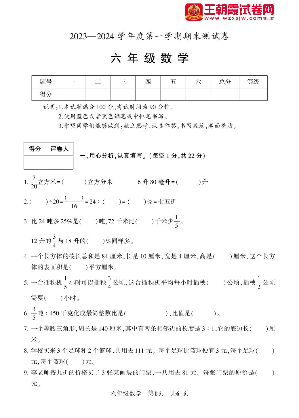山西省临汾市侯马市2023-2024学年度第一学期期末测试卷六年级数学(苏教版)