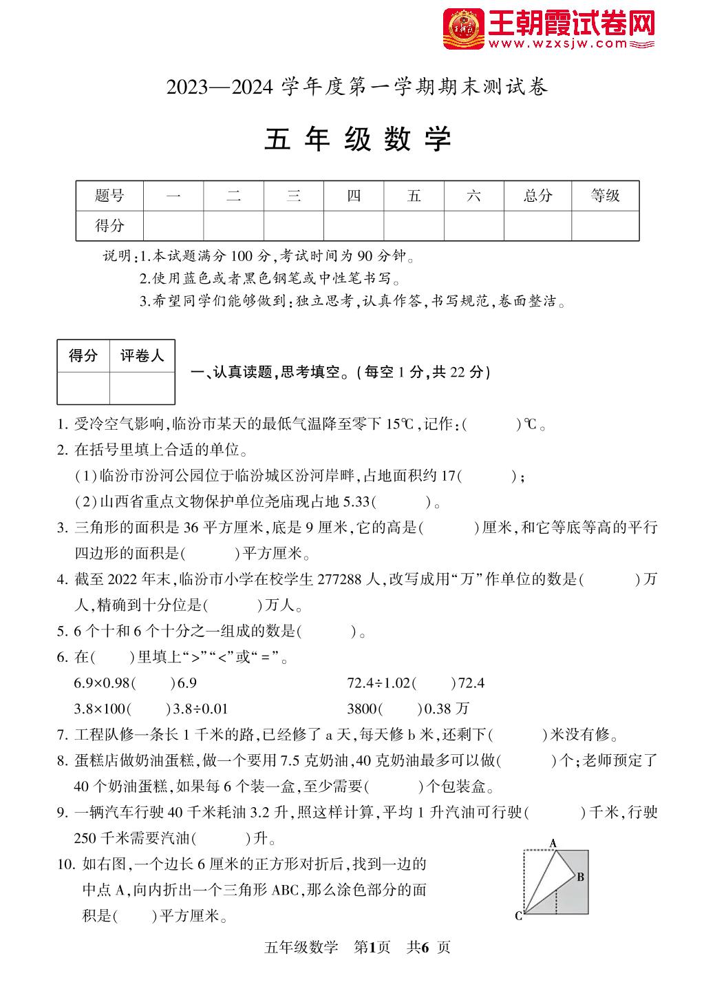 山西省临汾市侯马市2023-2024学年度第一学期期末测试卷五年级数学(苏教版)