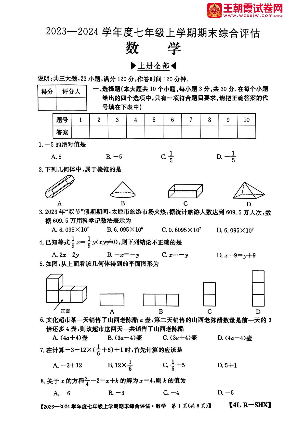 山西省大同市浑源县2023-2024学年度上学期期末综合评估七年级数学(人教版)