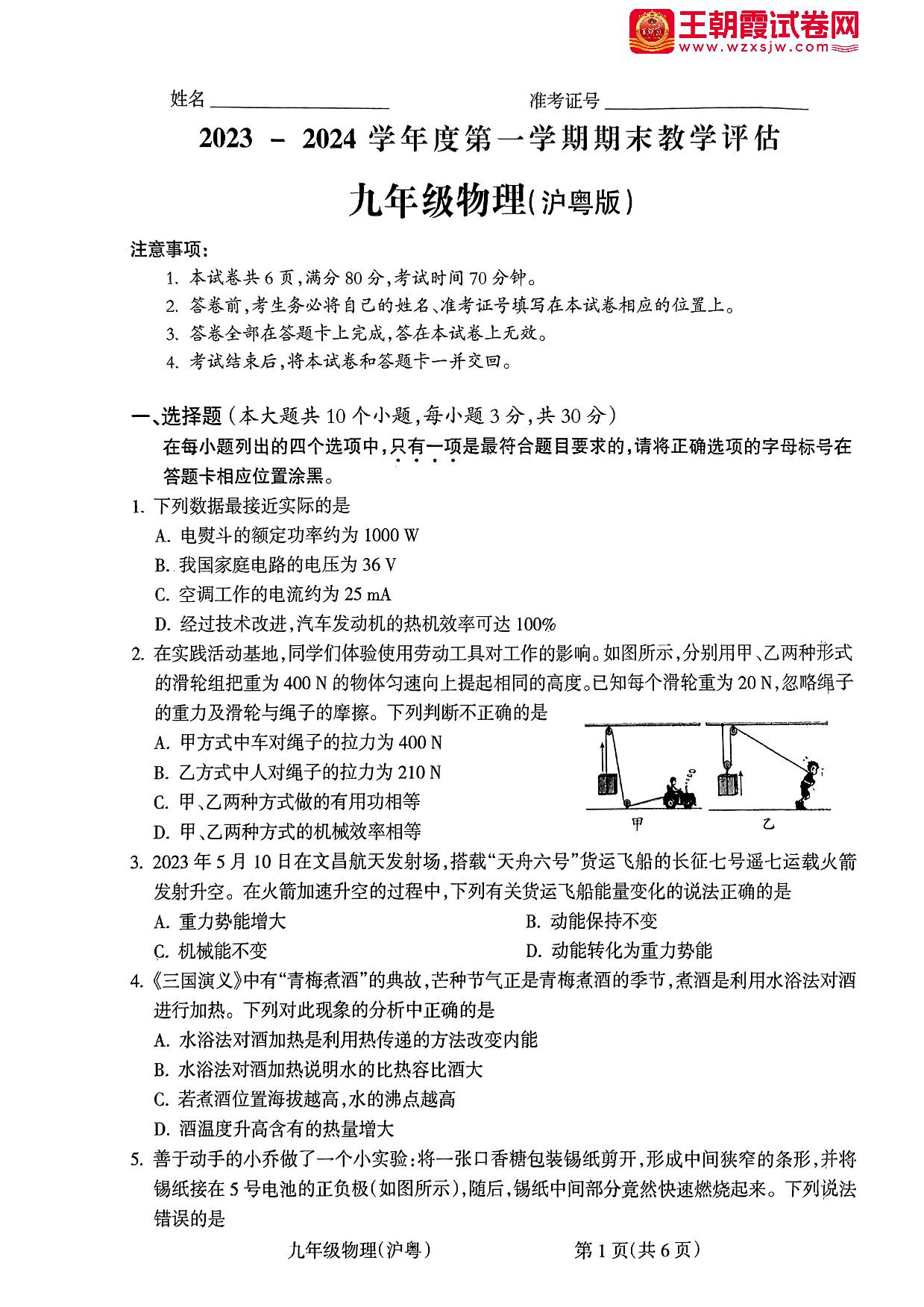 山西省长治市2023-2024学年度第一学期期末教学评估九年级物理(沪粤版)