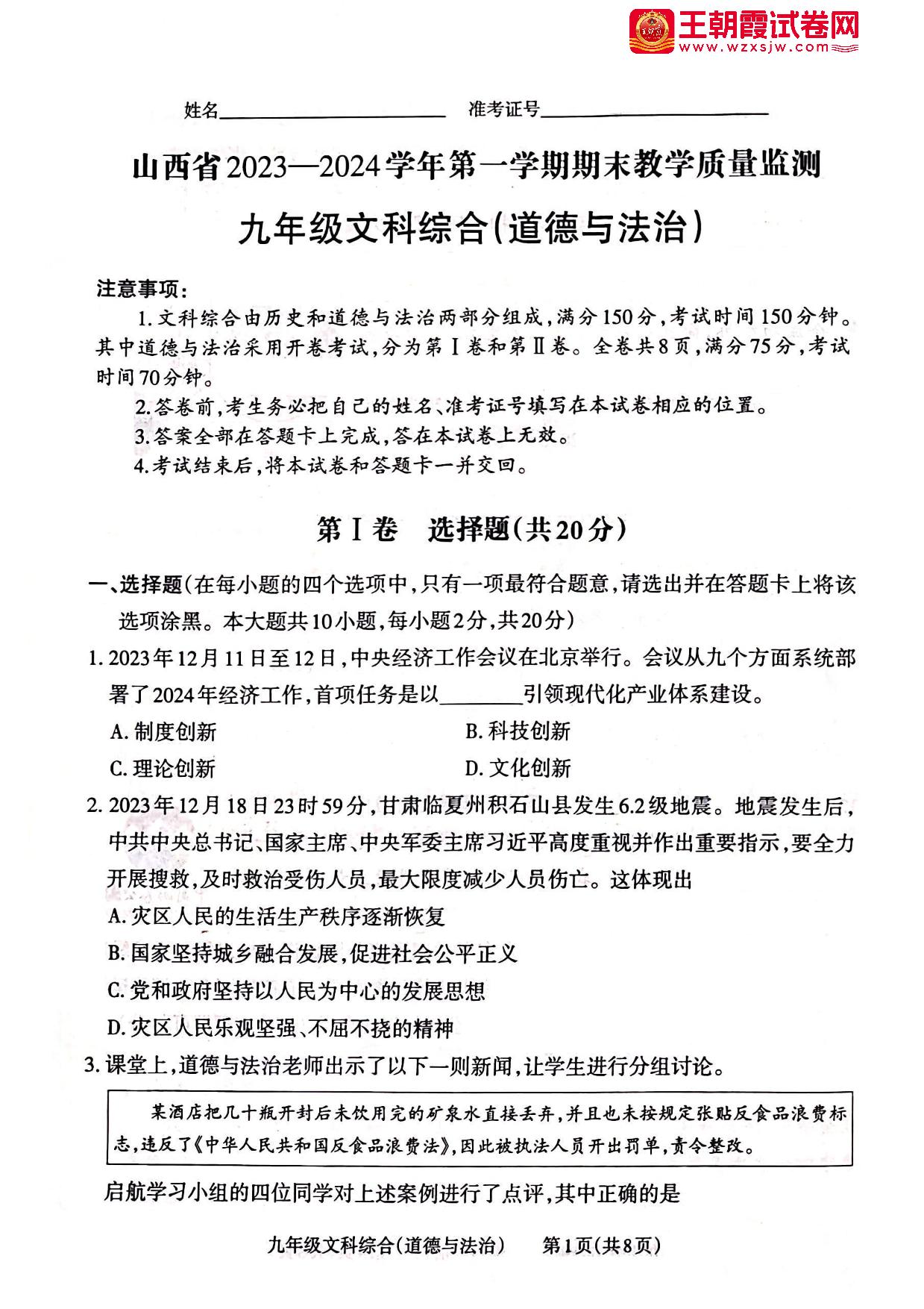 山西省长治市2023-2024学年第一学期期末教学质量监测九年级道德与法治(人教版)