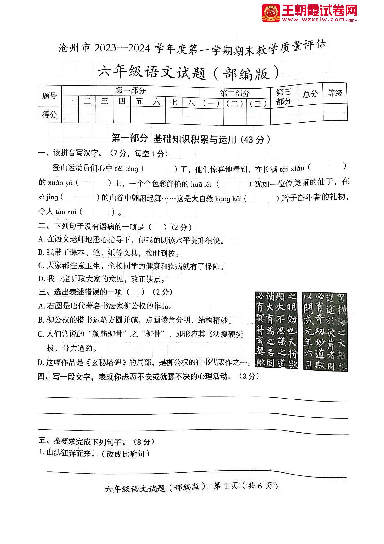 河北市沧州市2023-2024学年度第一学期期末教学质量评估六年级语文(人教版)