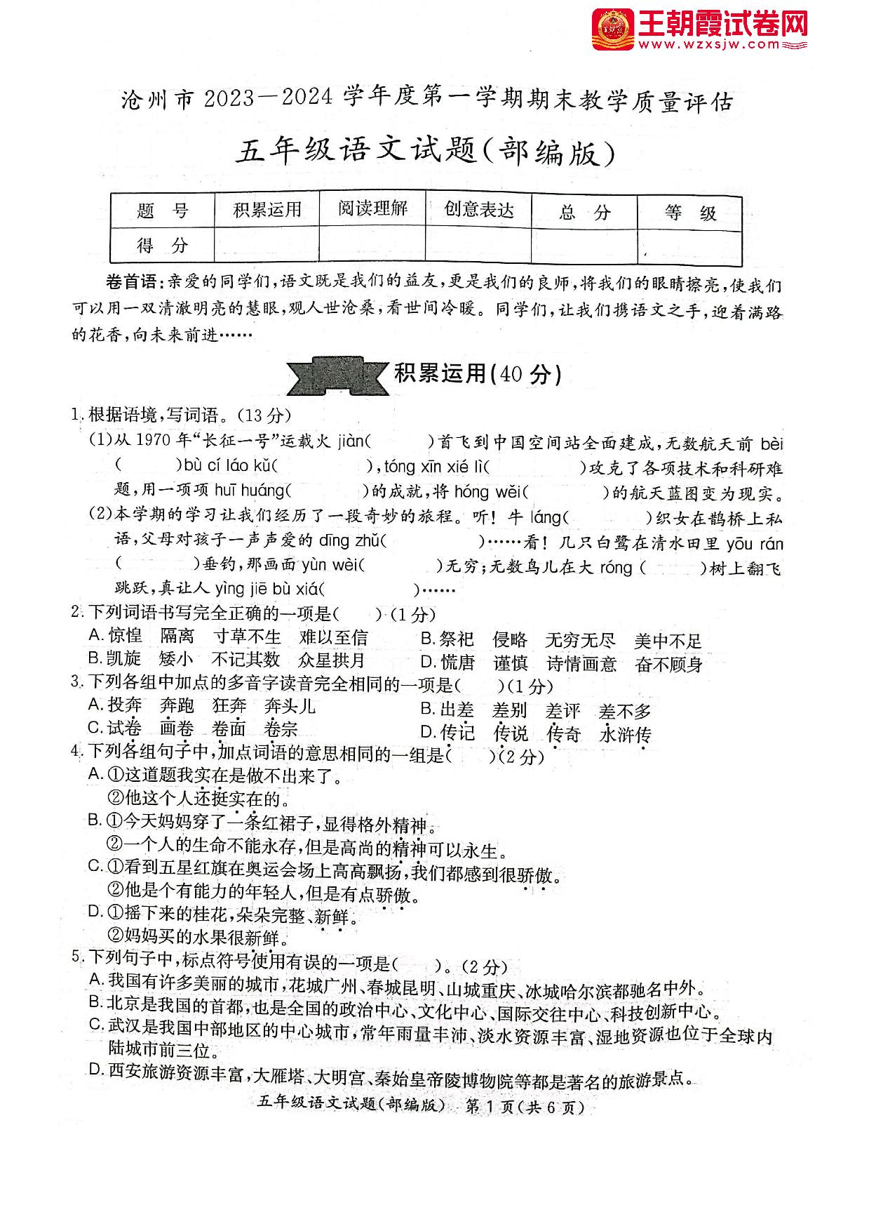 河北市沧州市2023-2024学年度第一学期期末教学质量评估五年级语文(人教版)
