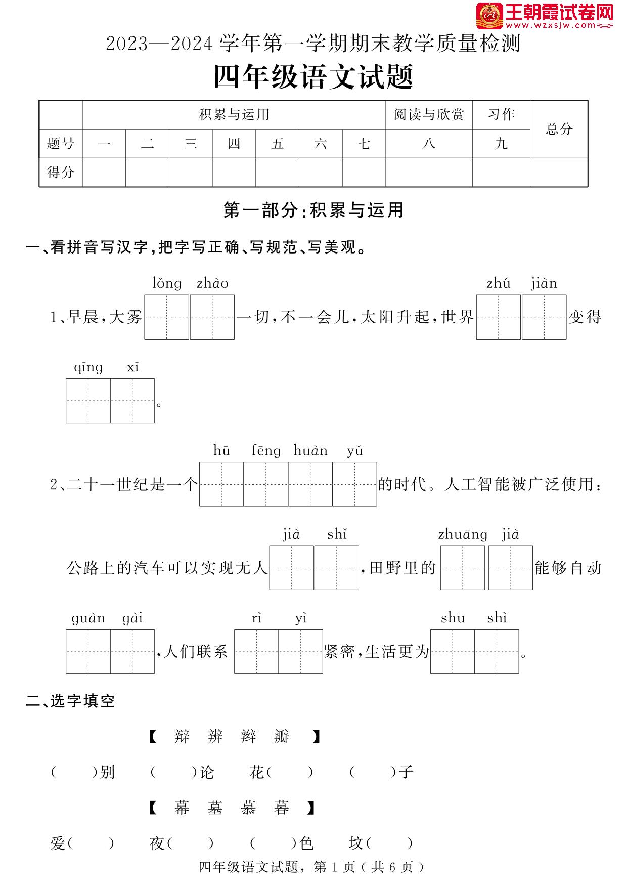 河北省石家庄市平山县2023-2024学年度第一学期期末教学质量检测四年级语文(人教版)