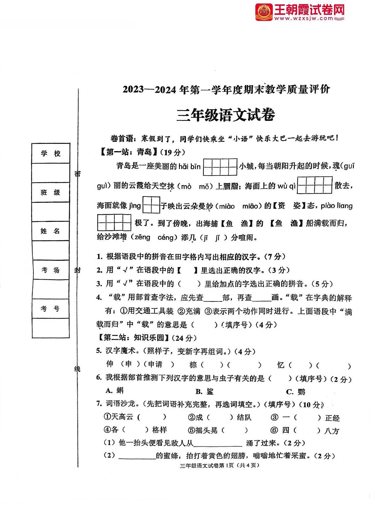 河北省邯郸市临漳县2023-2024学年度第一学期期末教学质量检测三年级语文(人教版)