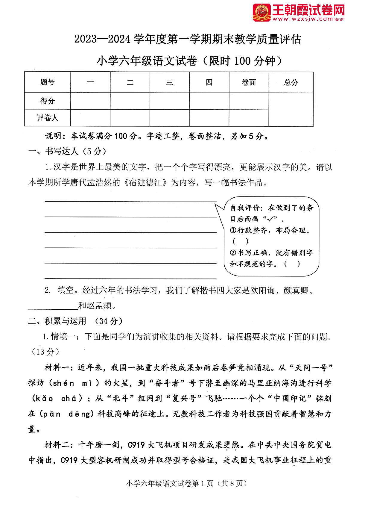 河北省沧州市盐山县2023-2024学年度第一学期期末教学质量评估六年级语文(人教版)