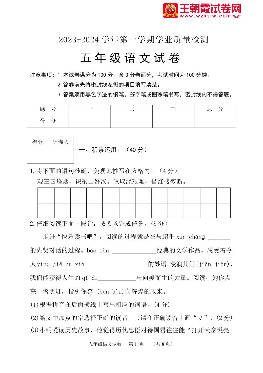 河北省保定市唐县2023-2024学年第一学期期末学业质量检测五年级语文(人教版)