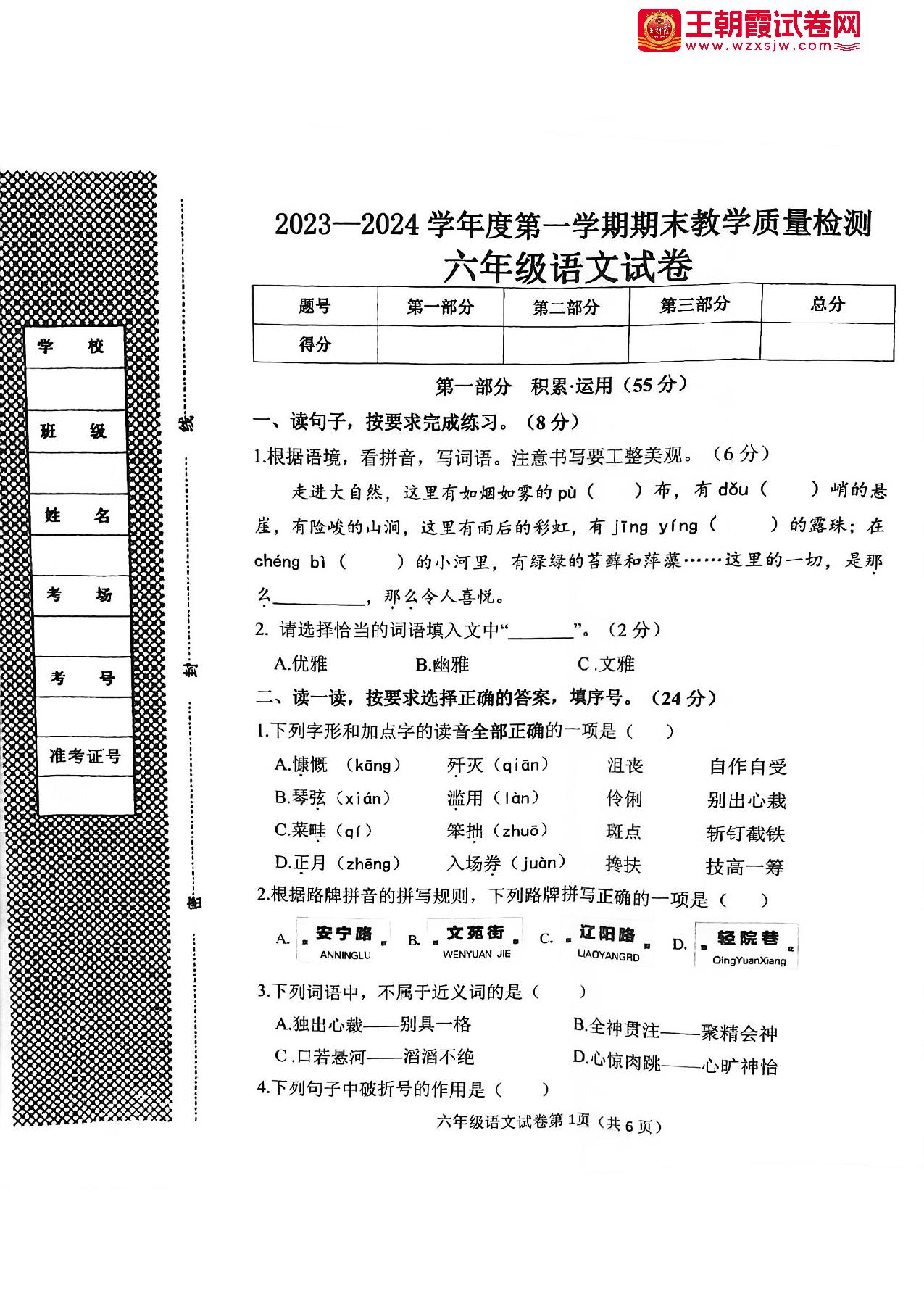 河北省邯郸市临漳县2023-2024学年度第一学期期末教学质量检测六年级语文(人教版)