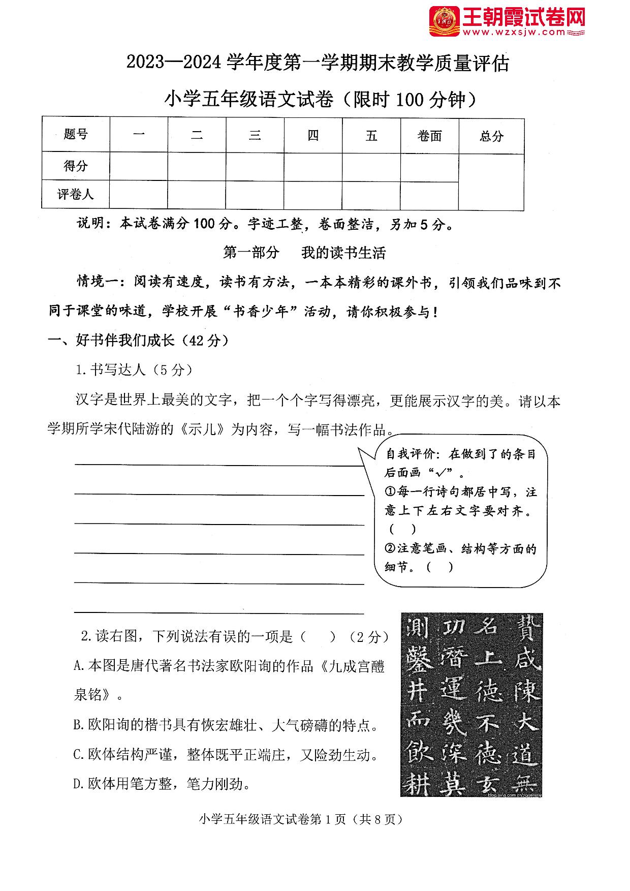 河北省沧州市盐山县2023-2024学年度第一学期期末教学质量评估五年级语文(人教版)