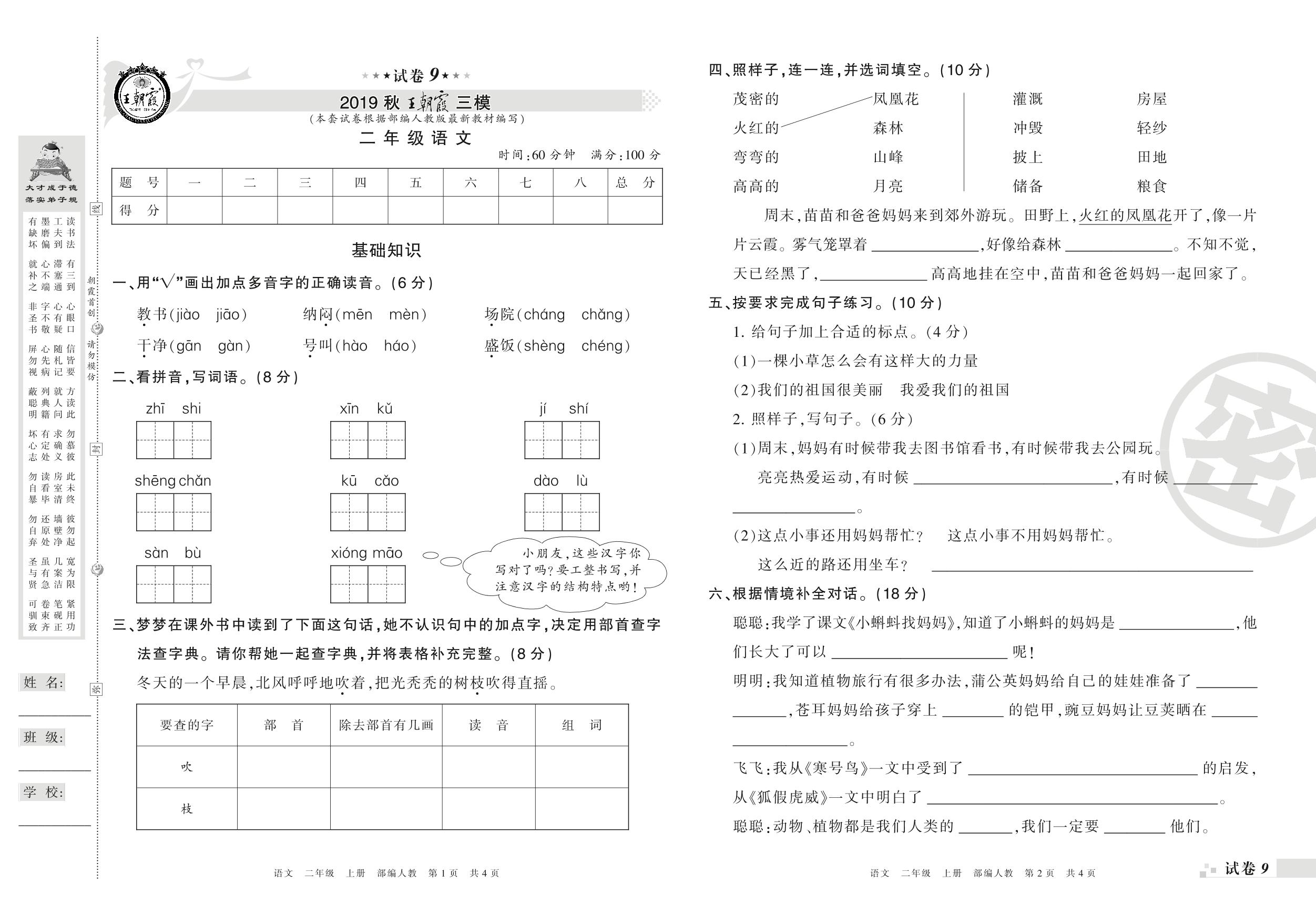 王朝霞期末模拟卷二年级上册语文(人教版)_R21080171155【9】