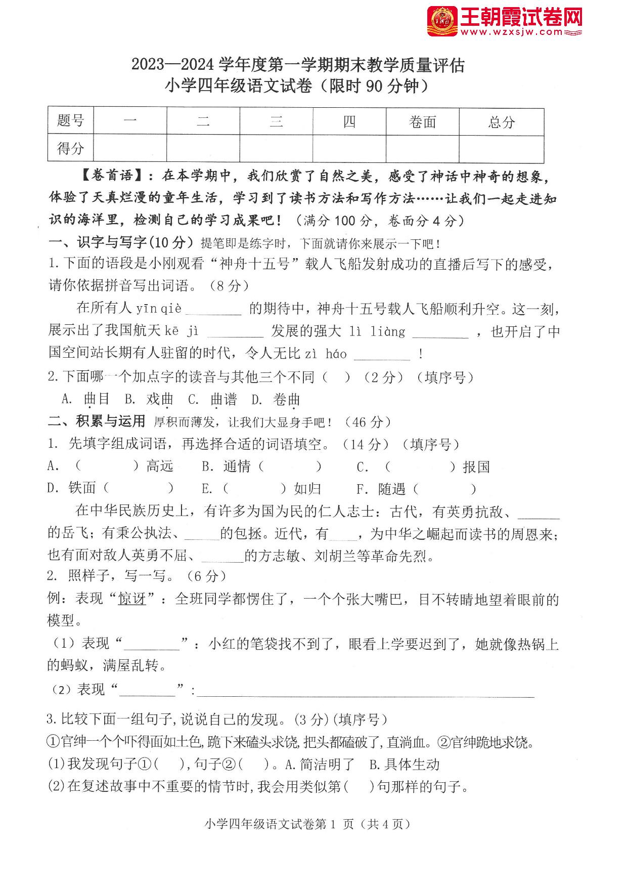 河北省沧州市盐山县2023-2024学年度第一学期期末教学质量评估四年级语文(人教版)