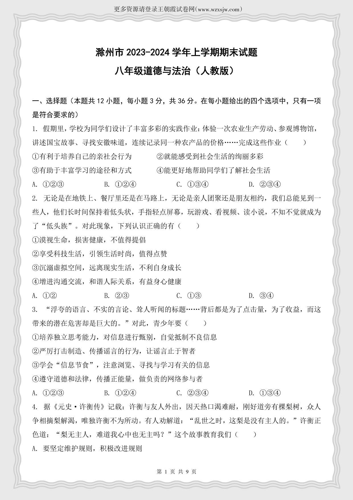 安徽省滁州市2023-2024学年上学期期末试题八年级道德与法治(人教版)