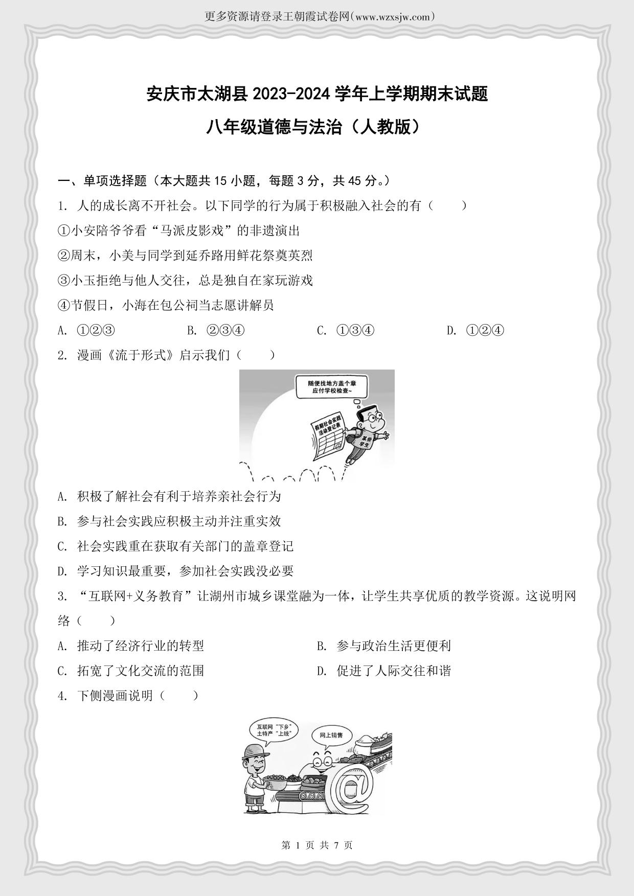 安徽省安庆市太湖县2023-2024学年上学期期末试题八年级道德与法治(人教版)
