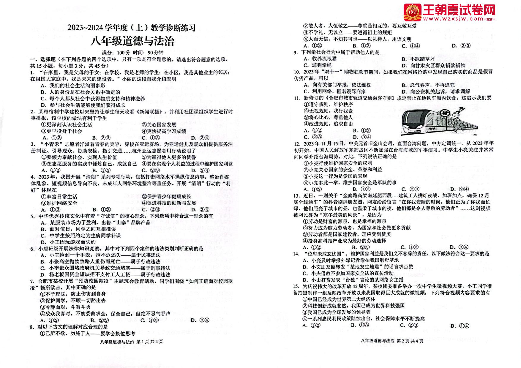 安徽省合肥市肥西县2023-2024学年度上学期末教学诊断练习八年级道德与法治(人教版)