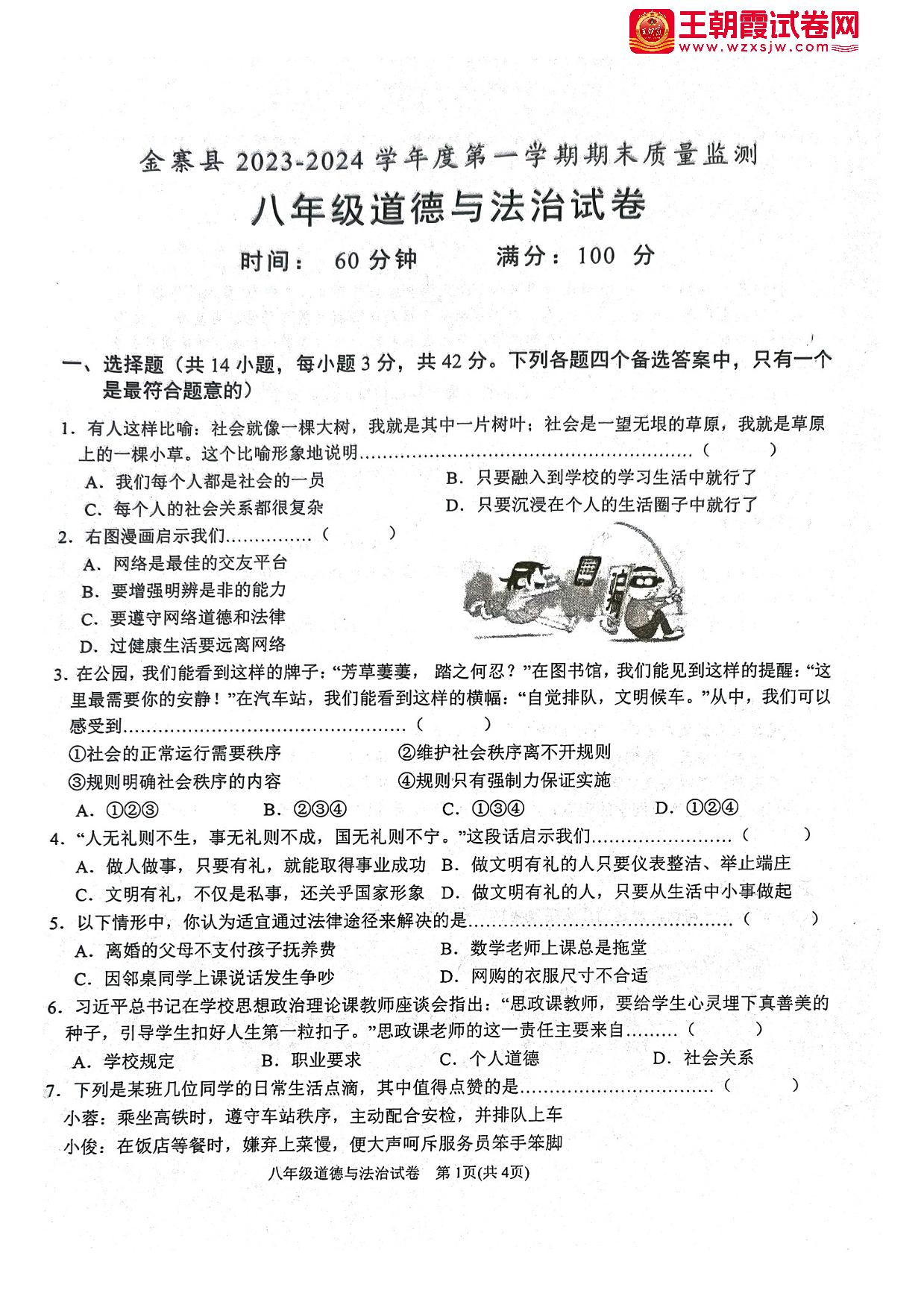 安徽省六安市金寨县2023-2024学年度第一学期期末质量监测八年级道德与法治(人教版)
