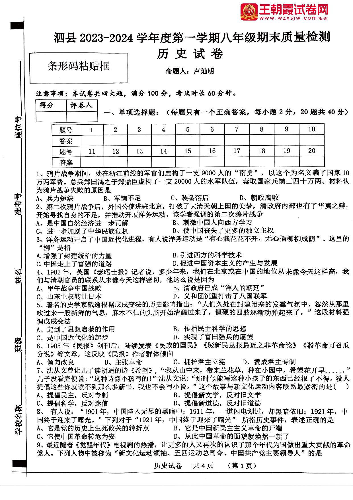 安徽省宿州市泗县2023-2024学年度第一学期期末质量检测八年级历史(人教版)