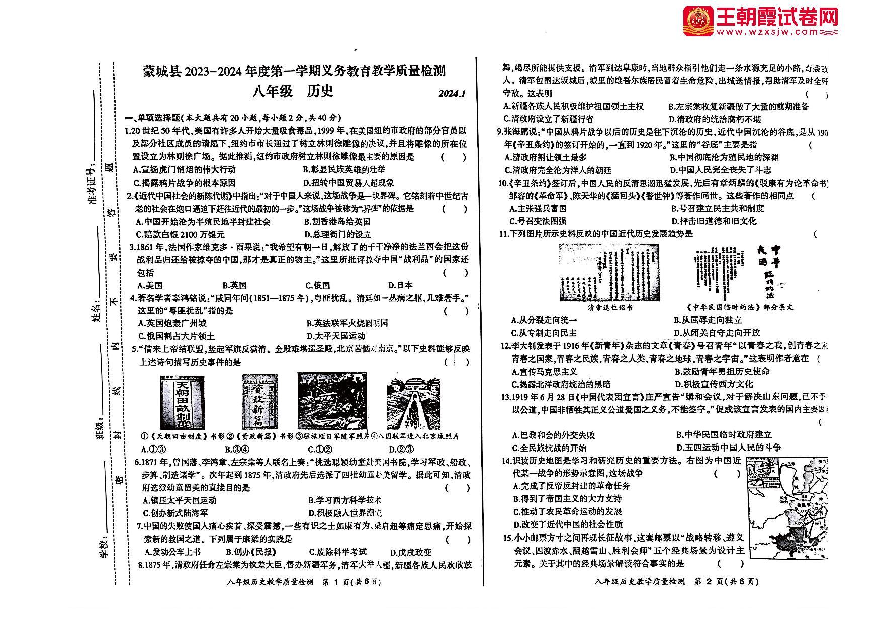 安徽省亳州市蒙城县2023-2024学年度第一学期期末教学质量检测八年级历史(人教版)