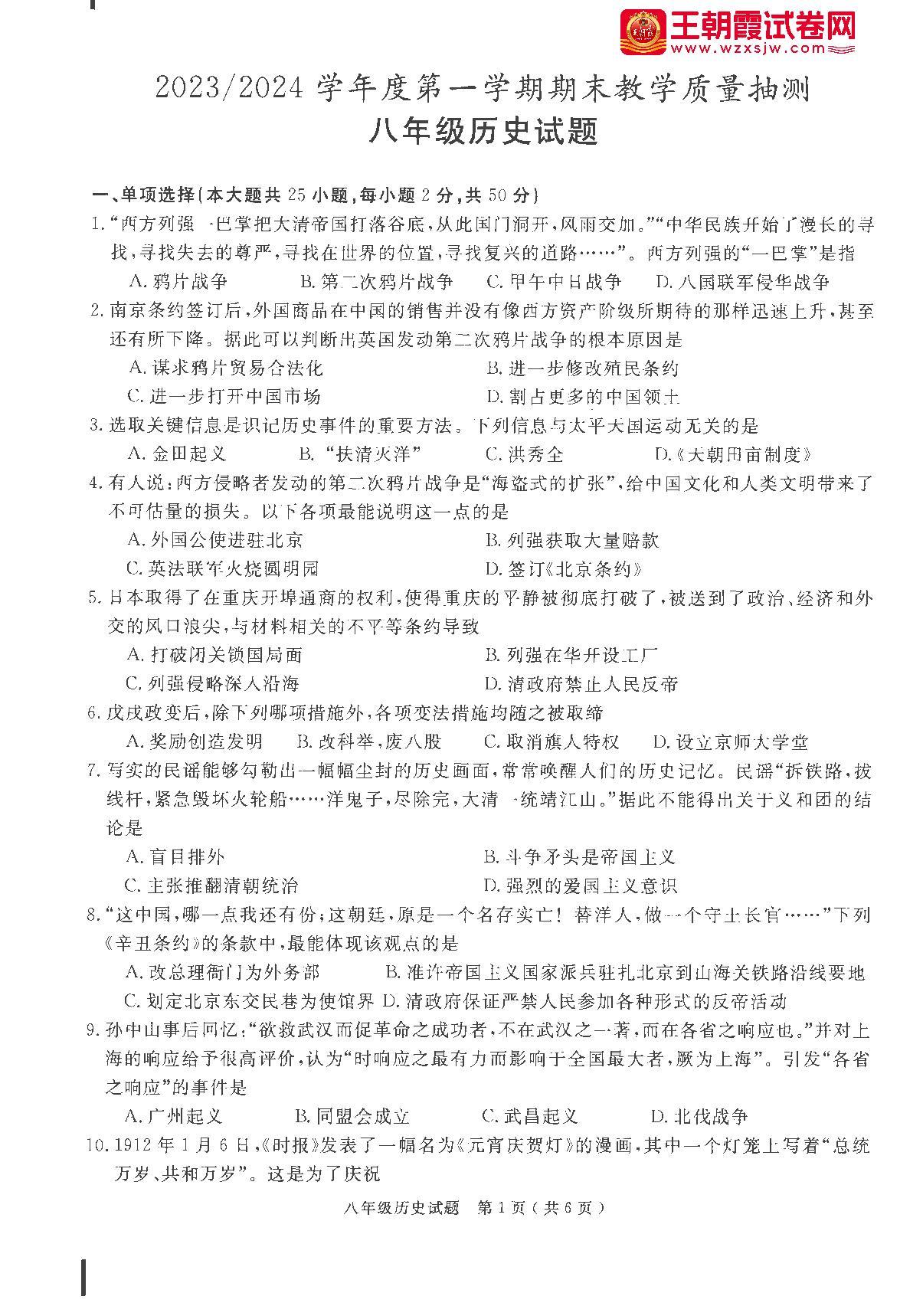 安徽省合肥市庐江县2023-2024学年第一学期期末教学质量抽测八年级历史(人教版)