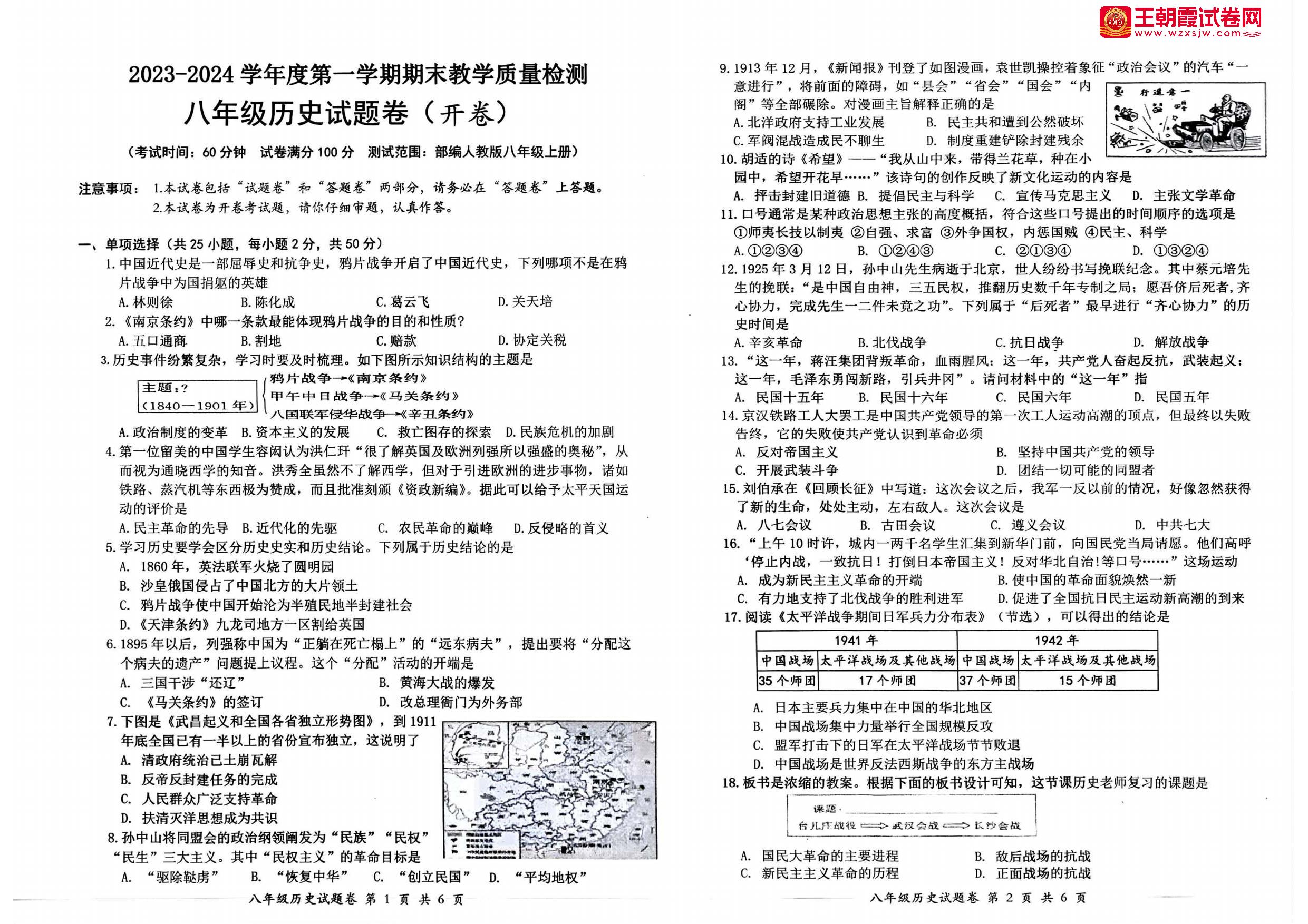 安徽省安庆市怀宁县2023-2024学年度第一学期期末教学质量检测八年级历史(人教版)