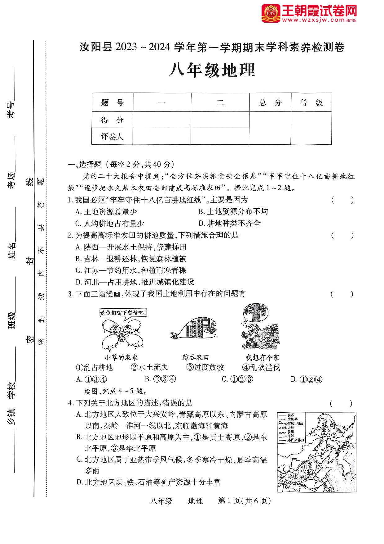 河南省洛阳市汝阳县2023-2024学年第一学期期末学科素养检测卷八年级地理(人教版)