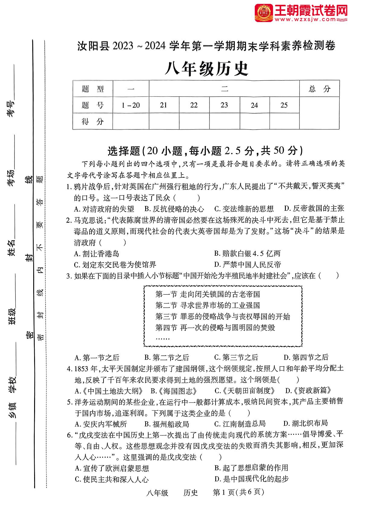 河南省洛阳市汝阳县2023-2024学年第一学期期末学科素养检测卷八年级历史(人教版)