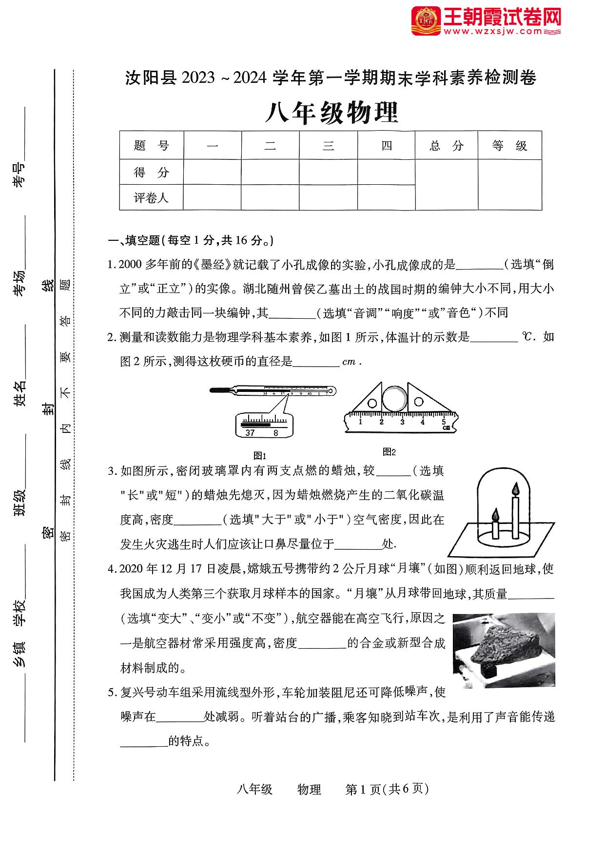 河南省洛阳市汝阳县2023-2024学年第一学期期末学科素养检测卷八年级物理(人教版)