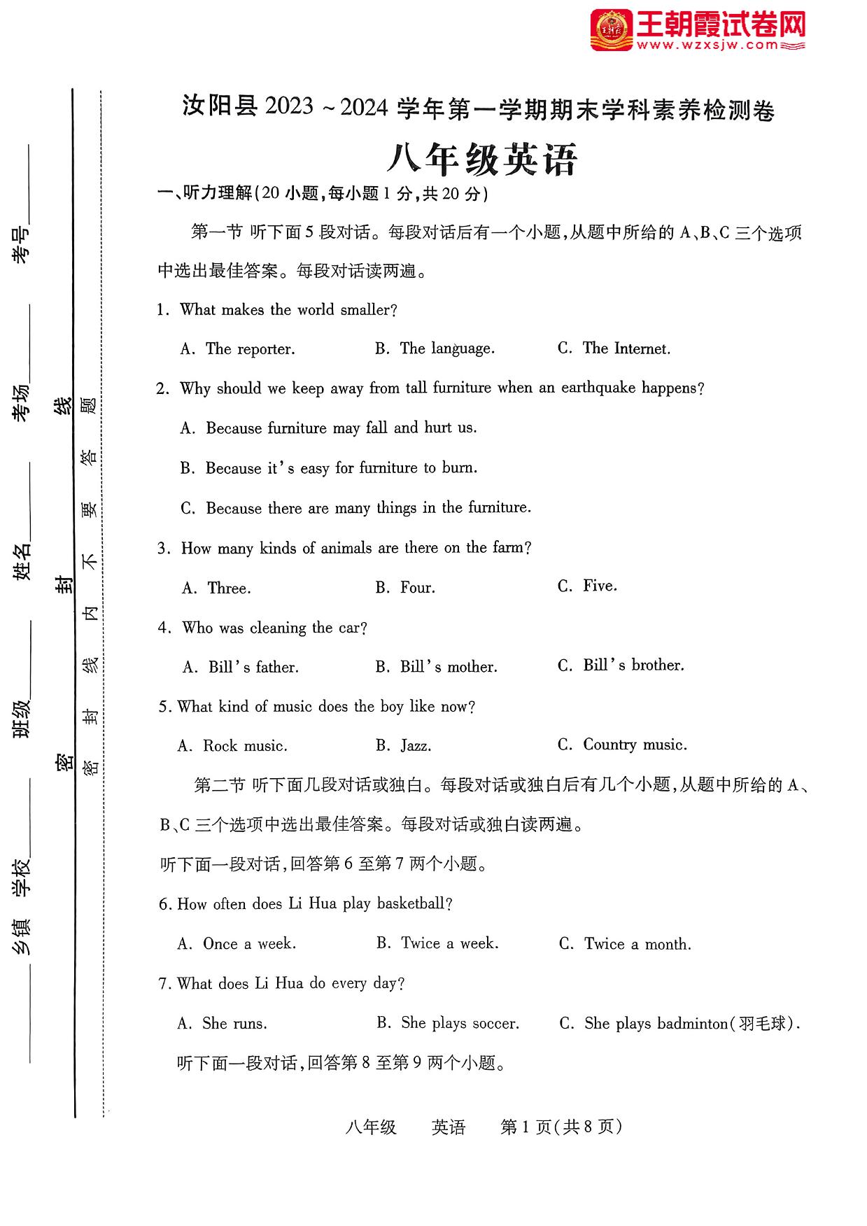 河南省洛阳市汝阳县2023-2024学年第一学期期末学科素养检测卷八年级英语(新课标版)【无听力音频】