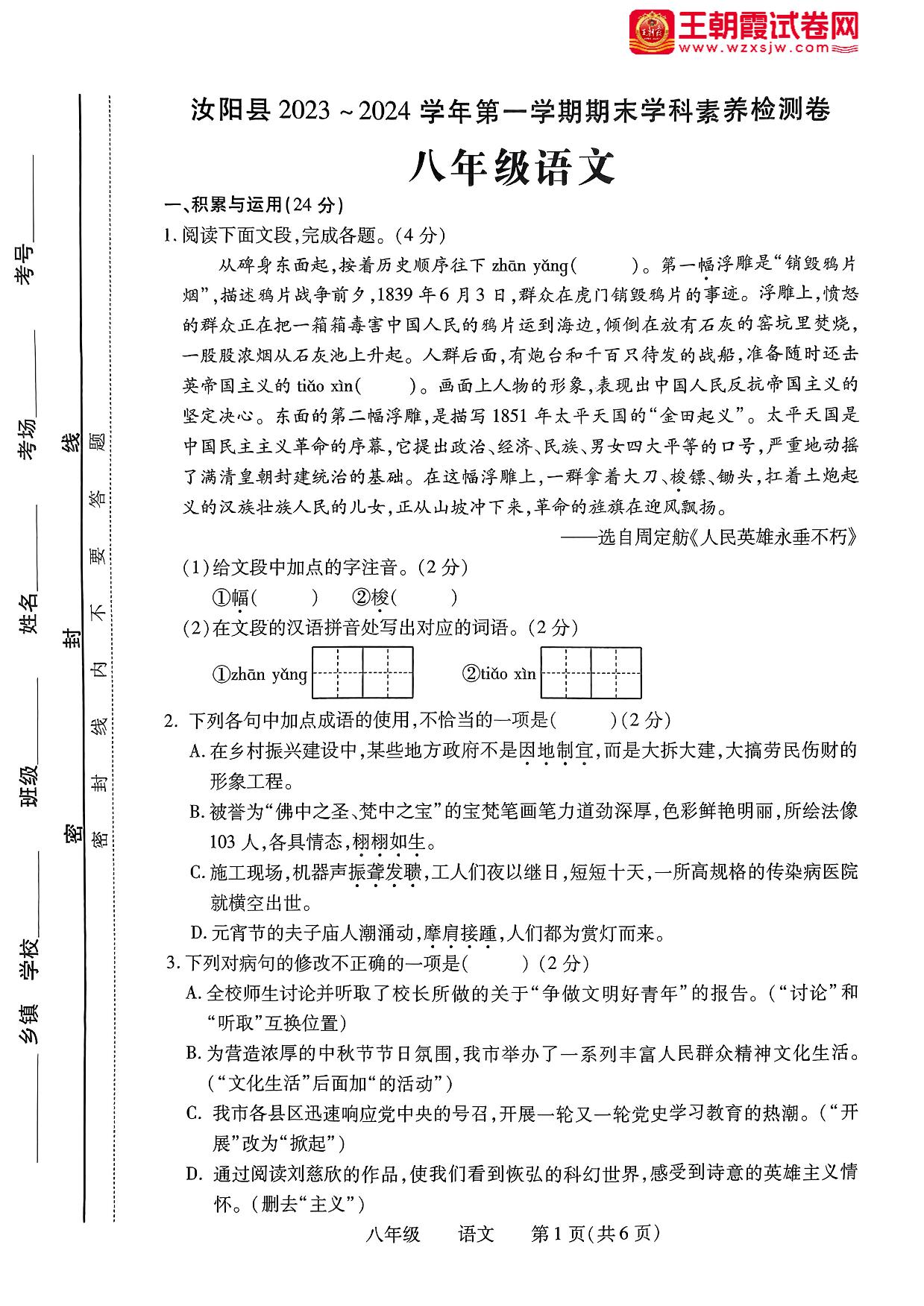 河南省洛阳市汝阳县2023-2024学年第一学期期末学科素养检测卷八年级语文(人教版)