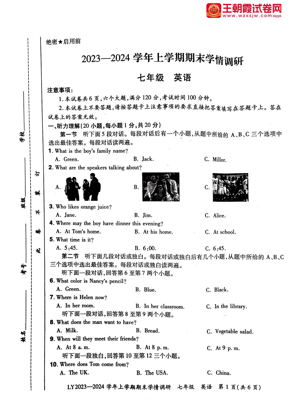 河南省洛阳市汝阳县2023-2024学年第一学期期末学科素养检测卷七年级英语(新课标版)【无听力音频】